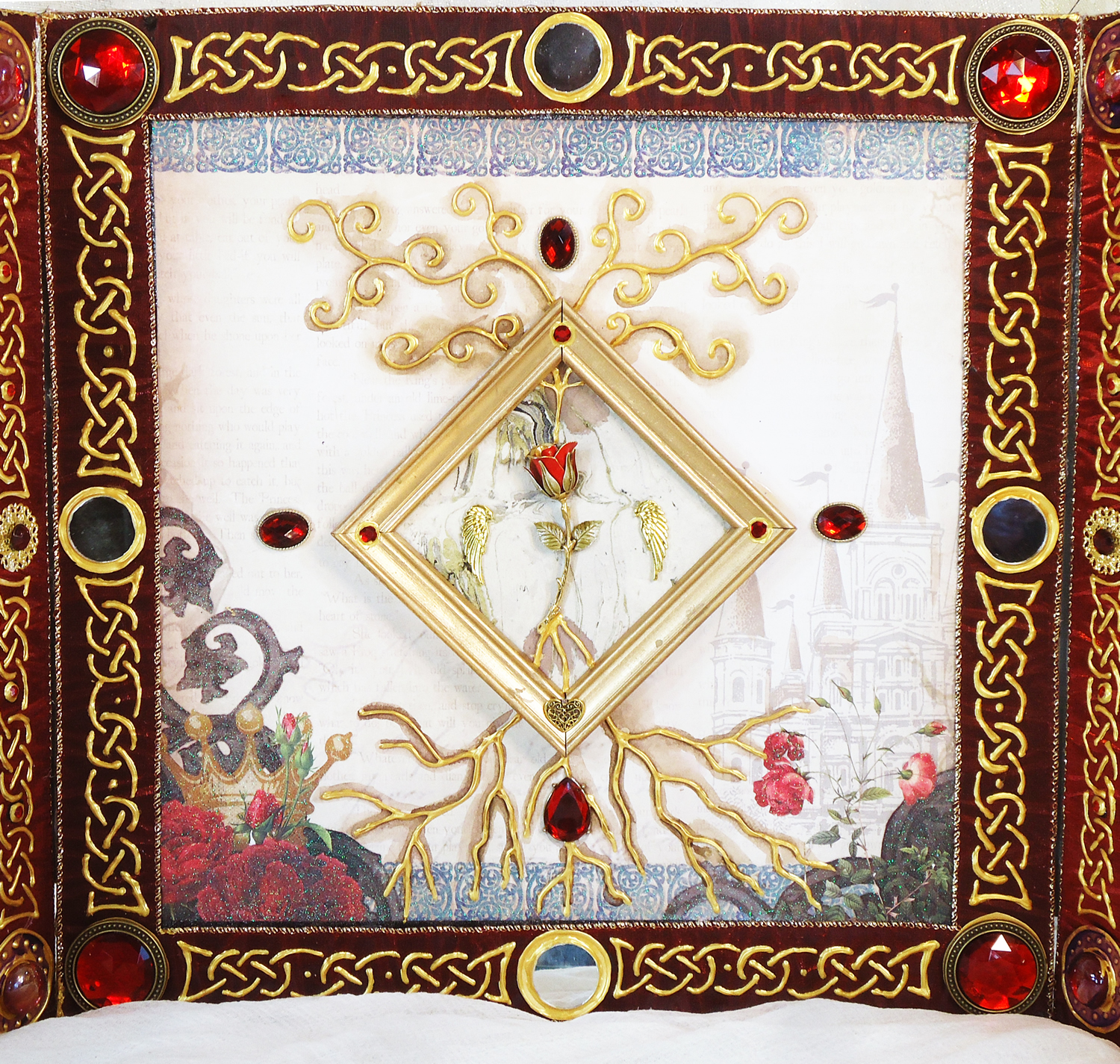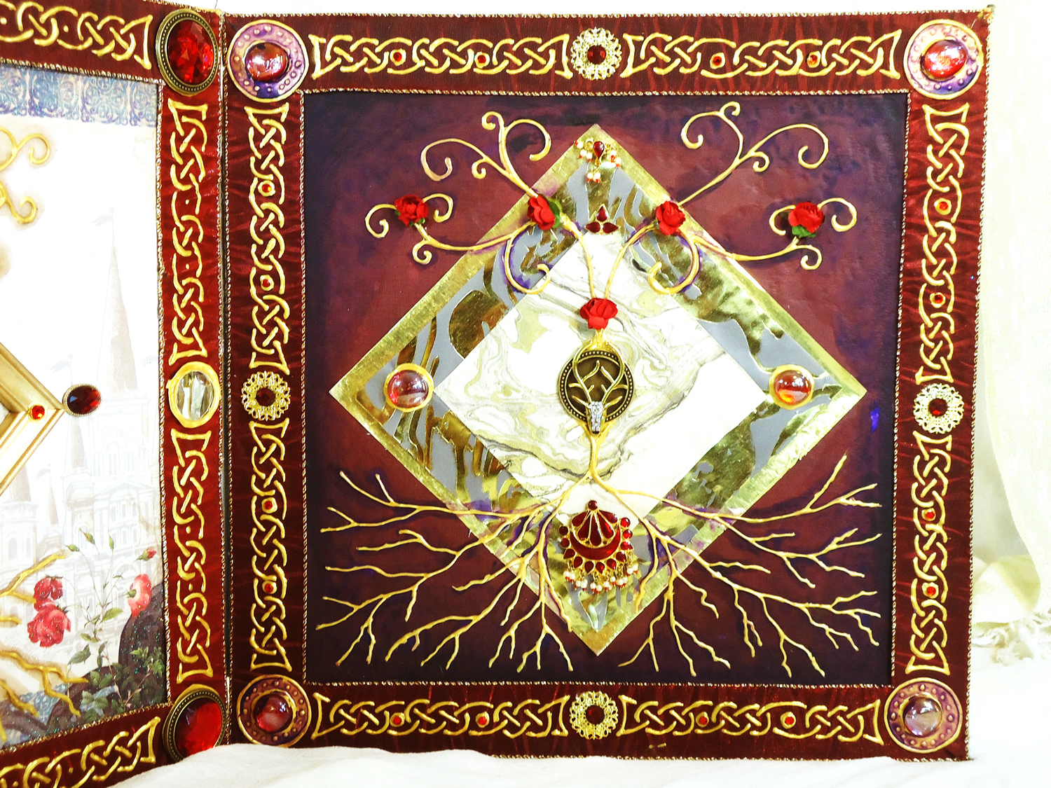 I’m pleased to offer hand-painted mixed media fairytale panels. Each individual square is 15” x 15” and these pieces can be displayed as a freestanding folding triptych on a table, or as three separate paintings hung on a wall. These lavishly decorated fairytale pieces feature metallic paint, textured fabric and paper, and embellishments such as keys, keyholes, functioning book lockets, hourglasses, and more.