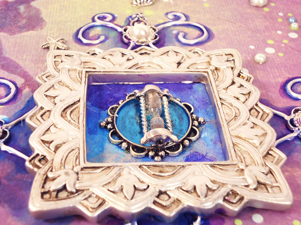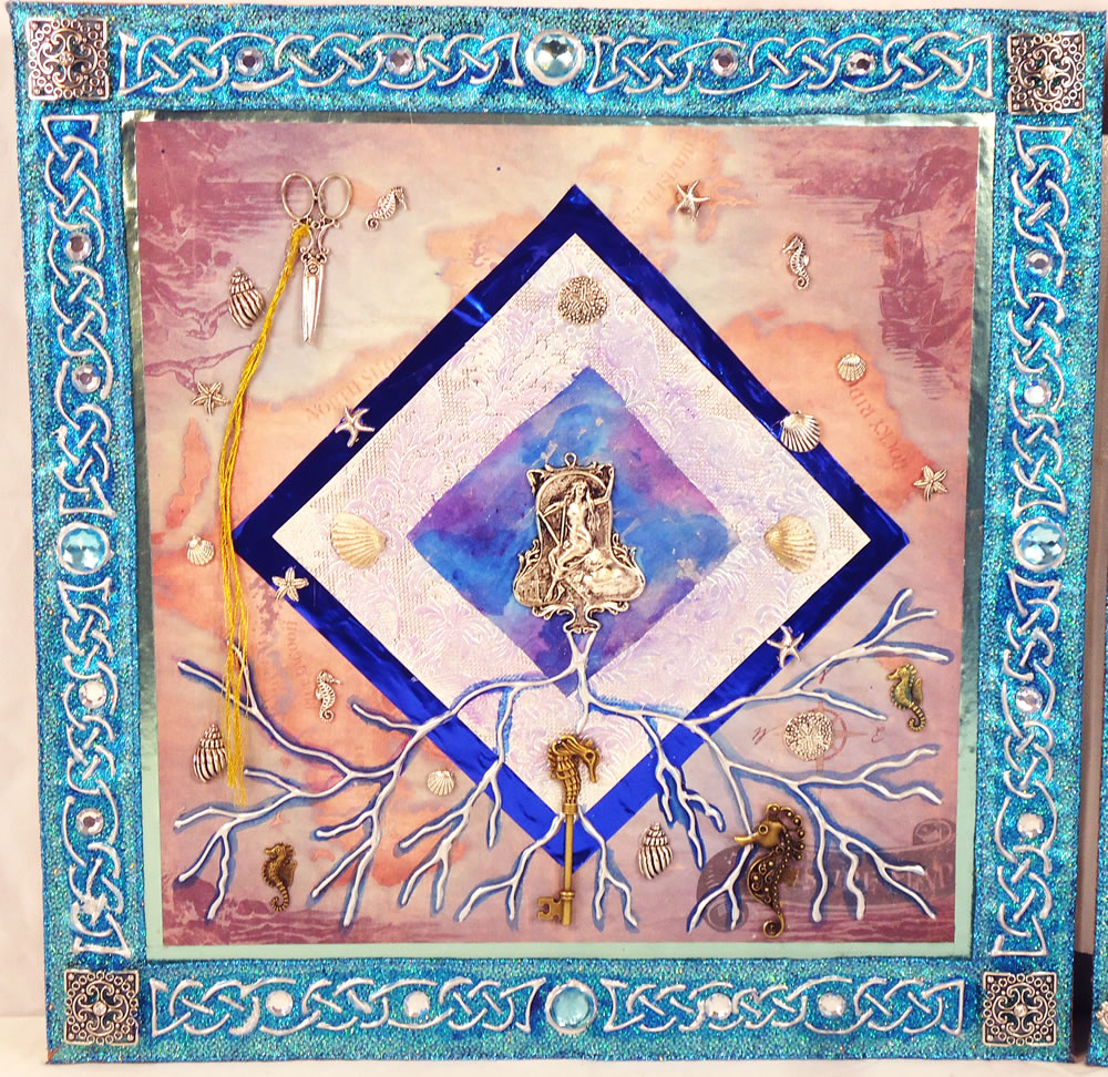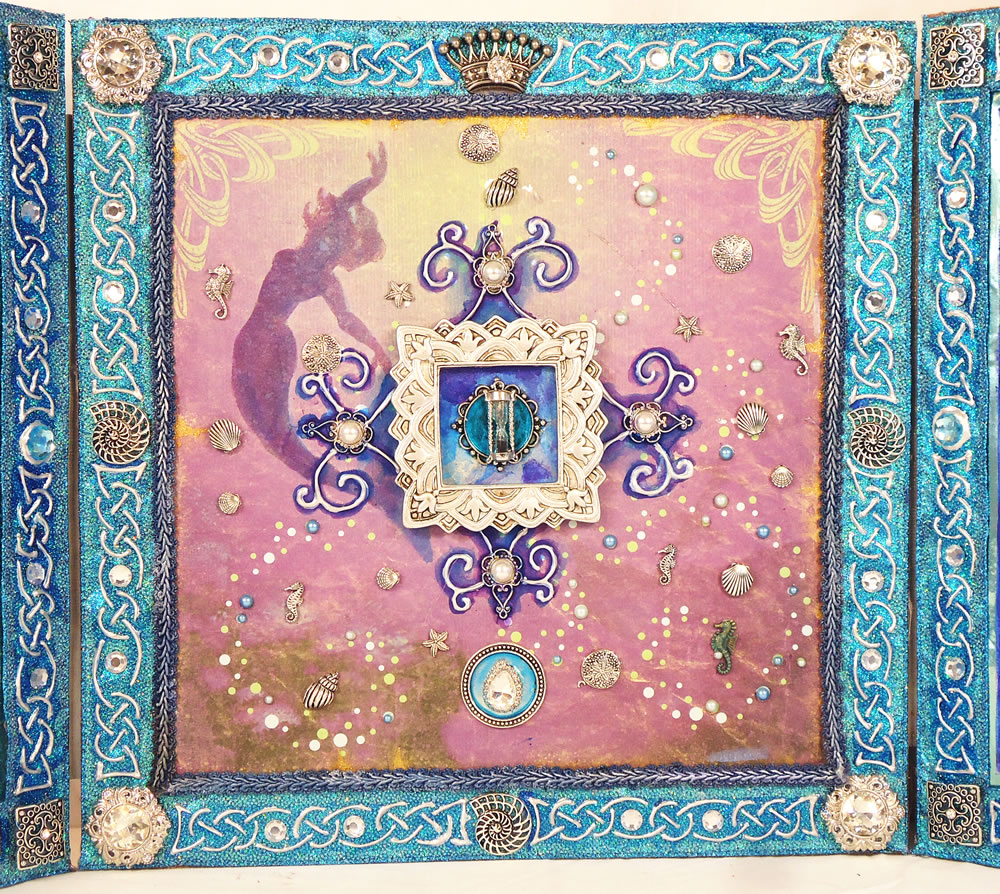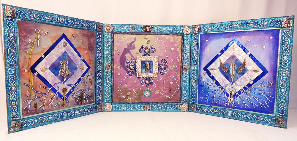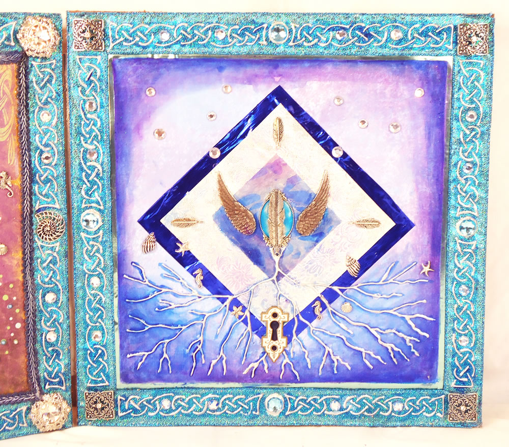 I’m pleased to offer hand-painted mixed media fairytale panels. Each individual square is 15” x 15” and these pieces can be displayed as a freestanding folding triptych on a table, or as three separate paintings hung on a wall. These lavishly decorated fairytale pieces feature metallic paint, textured fabric and paper, and embellishments such as keys, keyholes, functioning book lockets, hourglasses, and more.