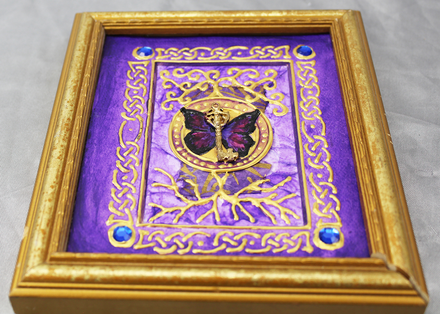 Gold and silver paint, tissue paper, acrylics, watercolors, textured paper, jewels, charms, metal objects.