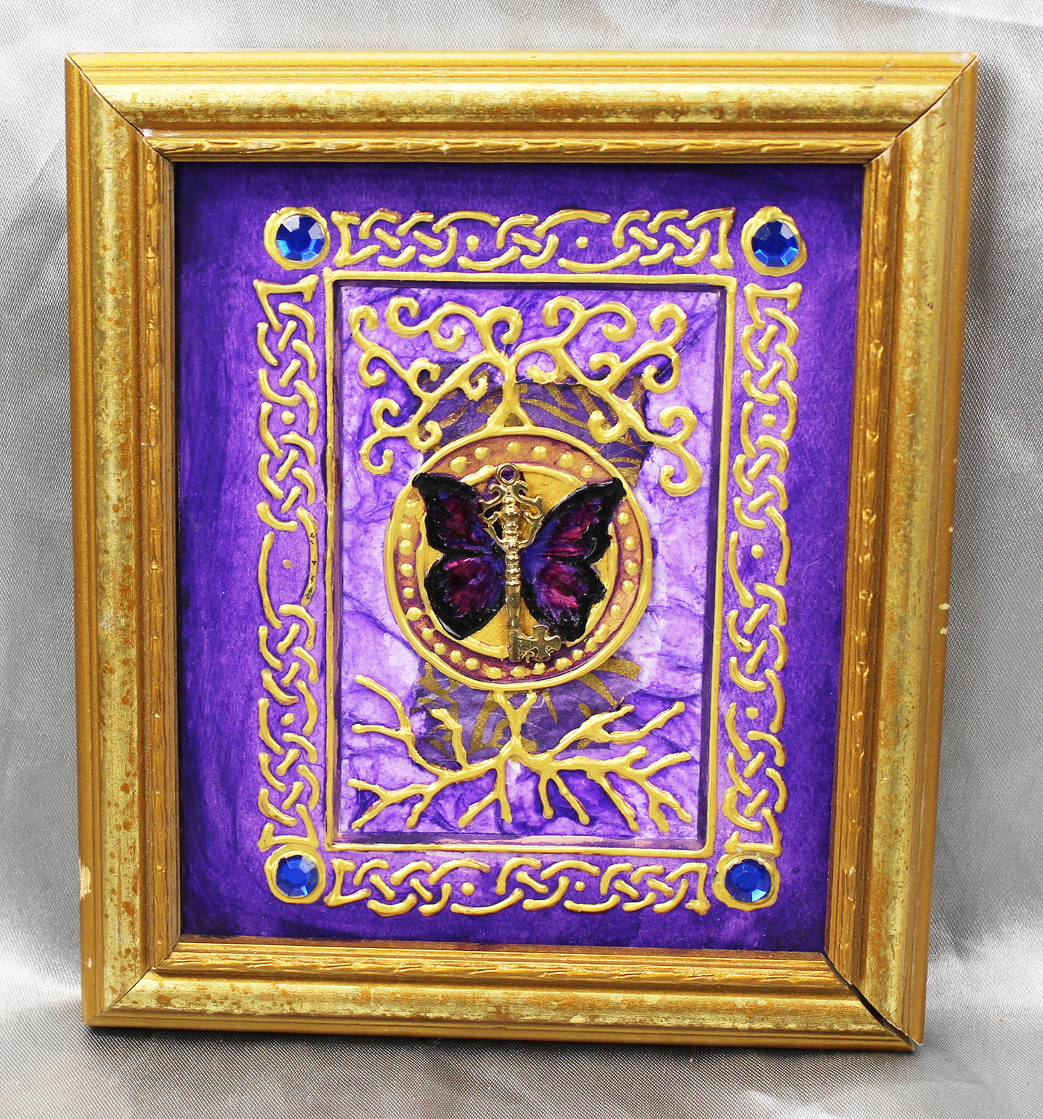 These pieces are created from layered and textured paint, paper, fabric, and other with raised gold or silver paint to create the design. The frame is included.