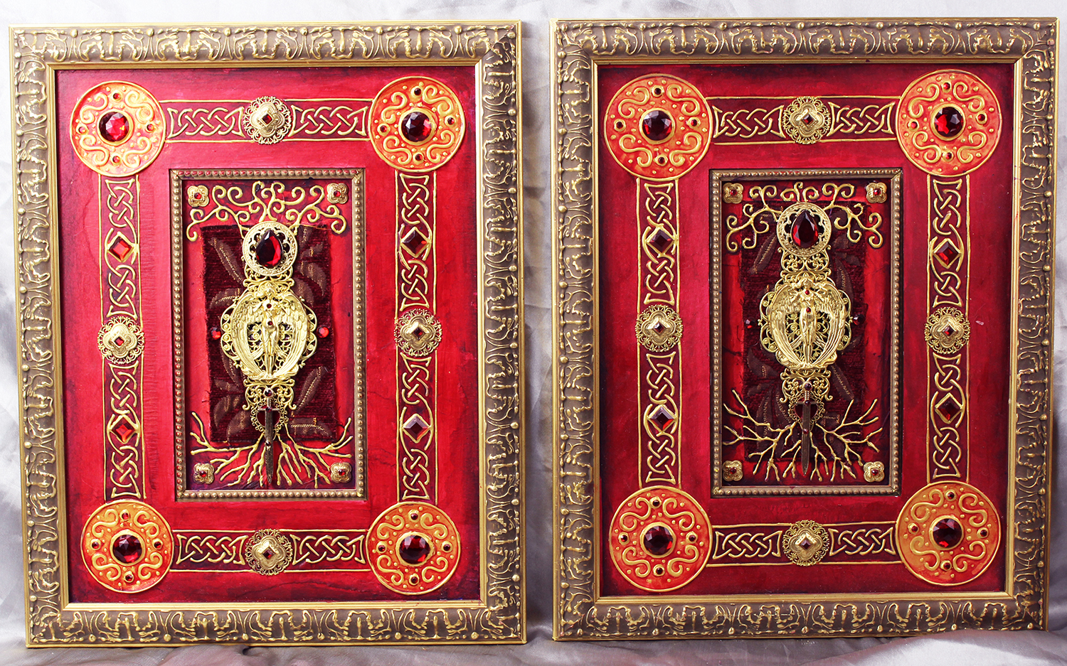 Gold and silver paint, tissue paper, acrylics, watercolors, textured paper, jewels, charms, metal objects.