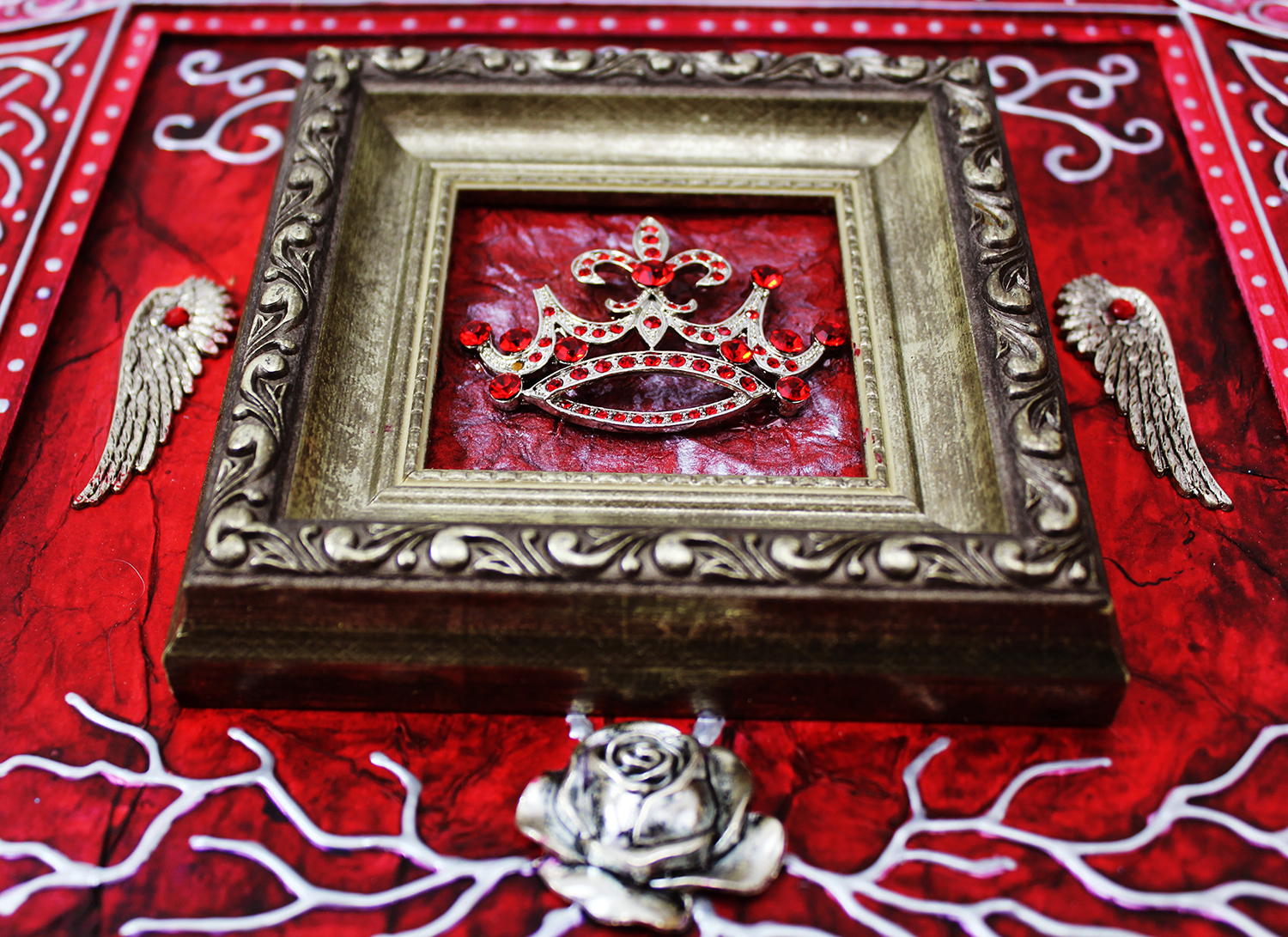 Gold and silver paint, tissue paper, acrylics, watercolors, textured paper, jewels, charms, metal objects.