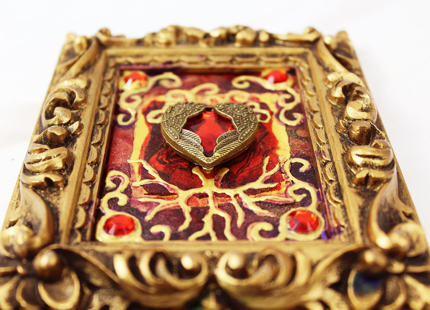 Gold and silver paint, tissue paper, acrylics, watercolors, textured paper, jewels, charms, metal objects.