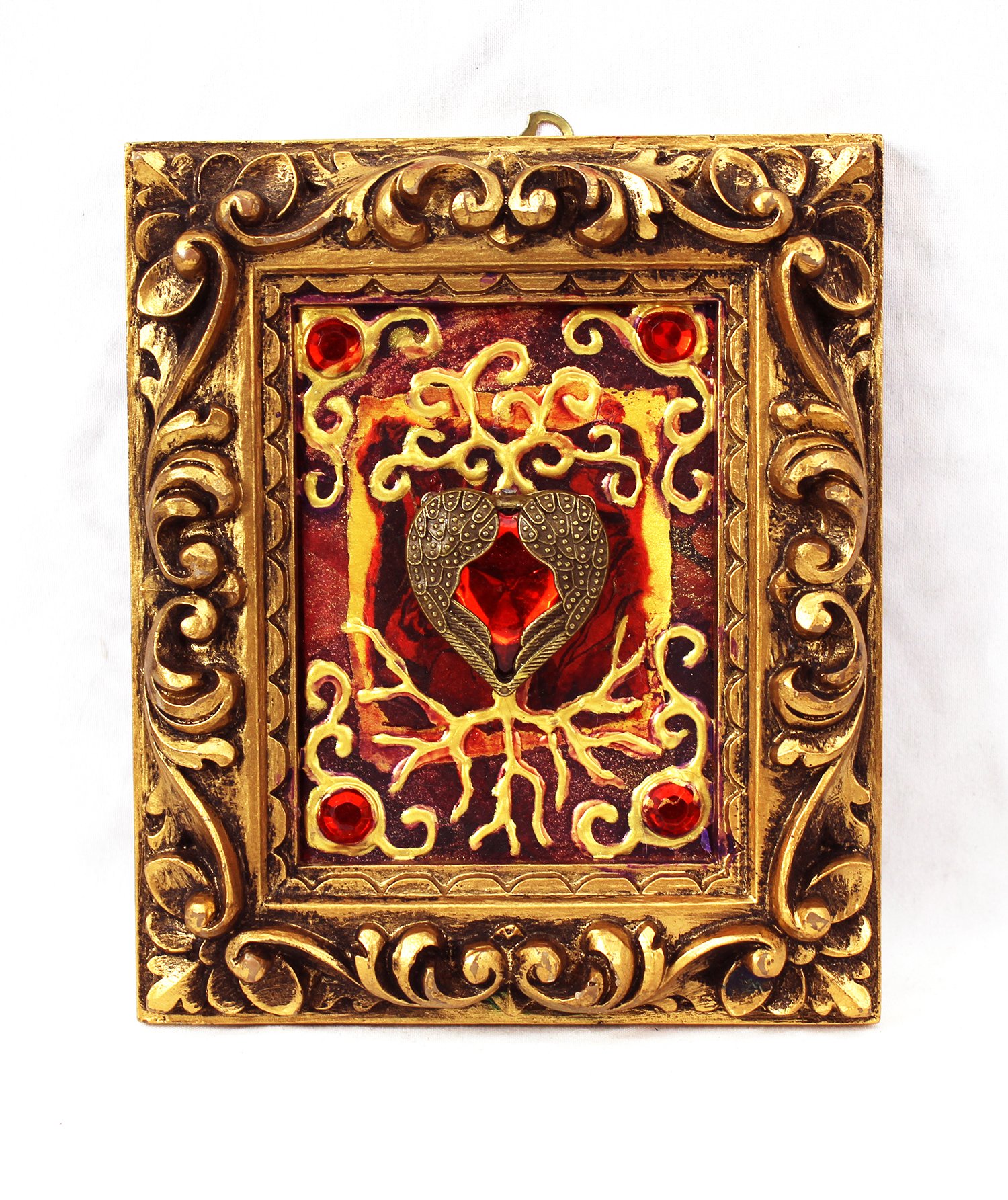 These pieces are created from layered and textured paint, paper, fabric, and other with raised gold or silver paint to create the design. The frame is included.