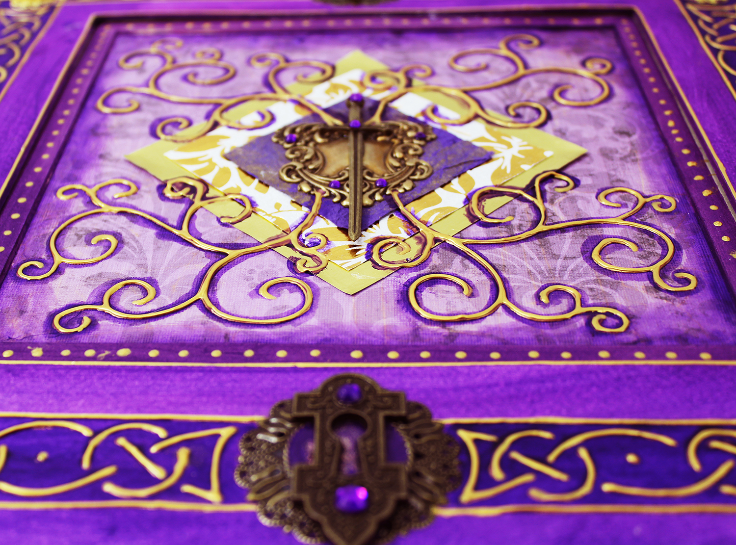 Gold and silver paint, tissue paper, acrylics, watercolors, textured paper, jewels, charms, metal objects.