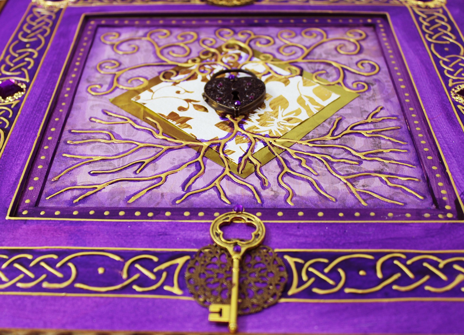 Gold and silver paint, tissue paper, acrylics, watercolors, textured paper, jewels, charms, metal objects.