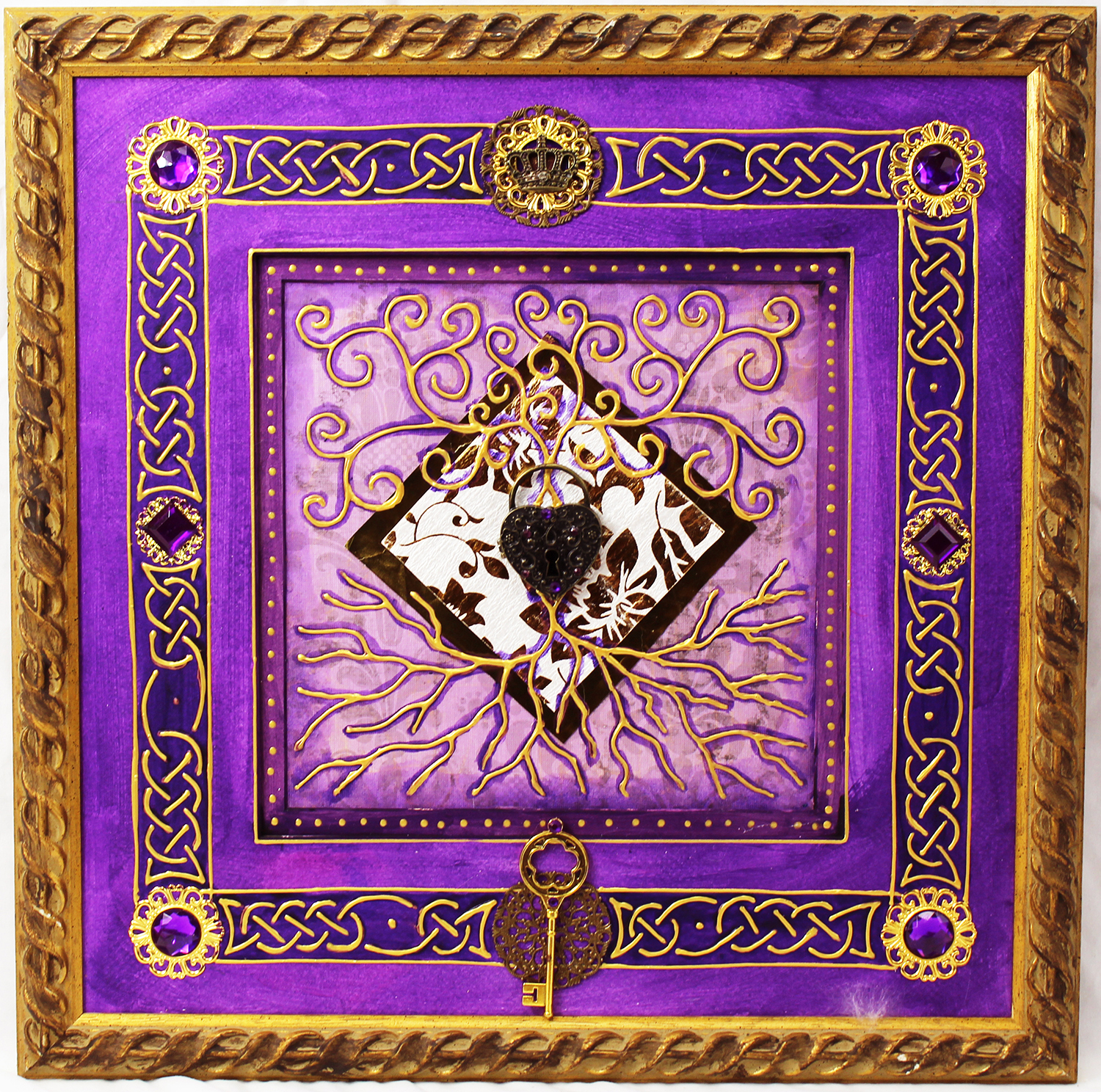 These pieces are created from layered and textured paint, paper, fabric, and other with raised gold or silver paint to create the design. The frame is included.