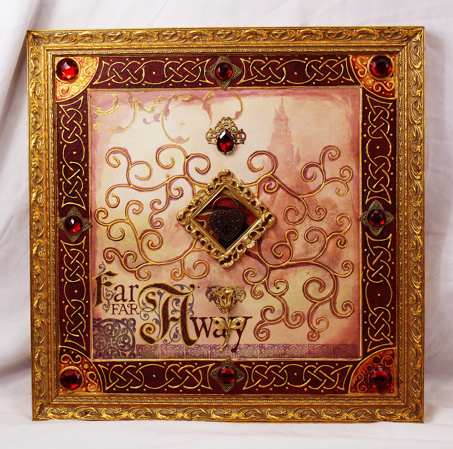 Gold and silver paint, tissue paper, acrylics, watercolors, textured paper, jewels, charms, metal objects.