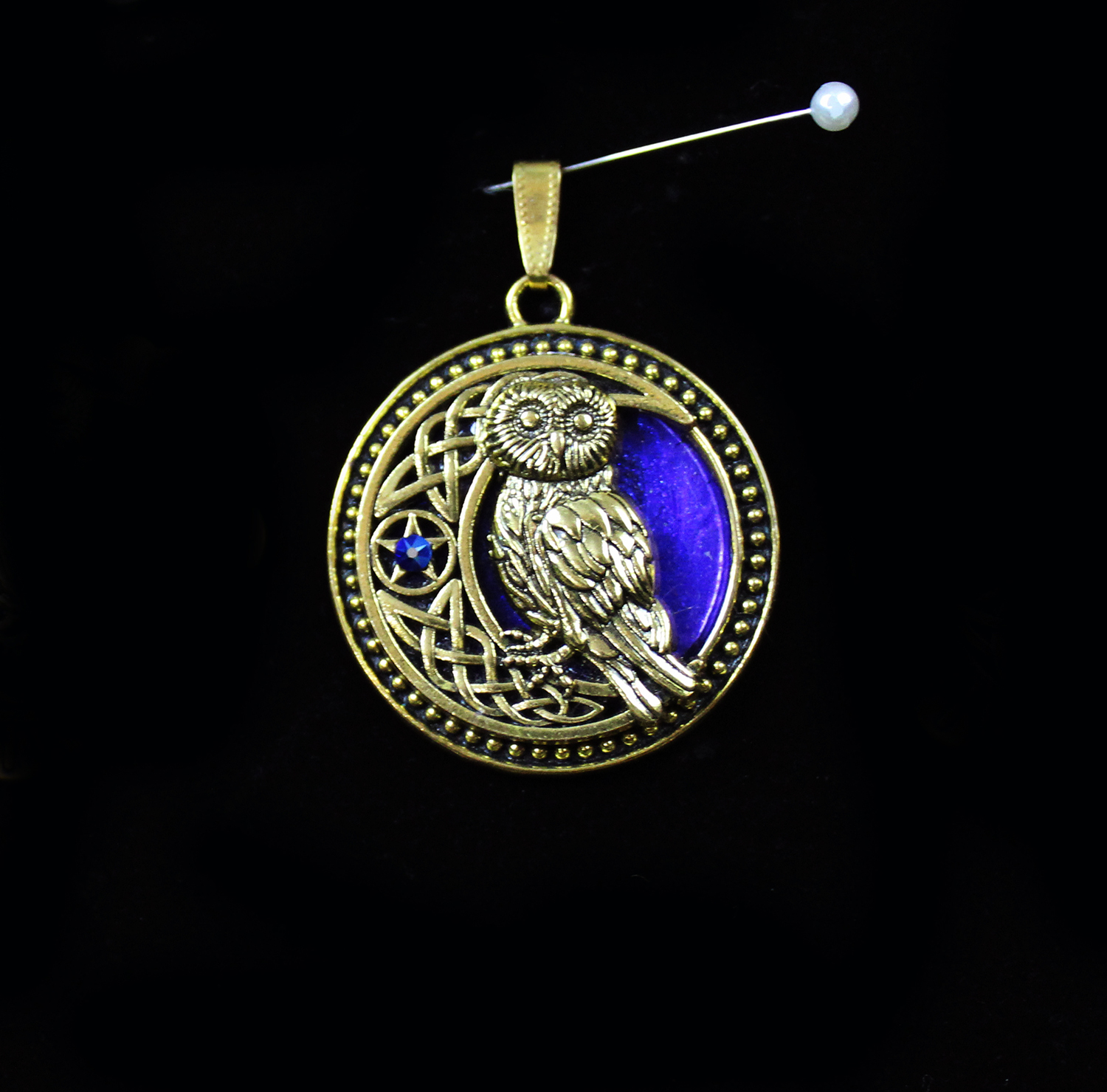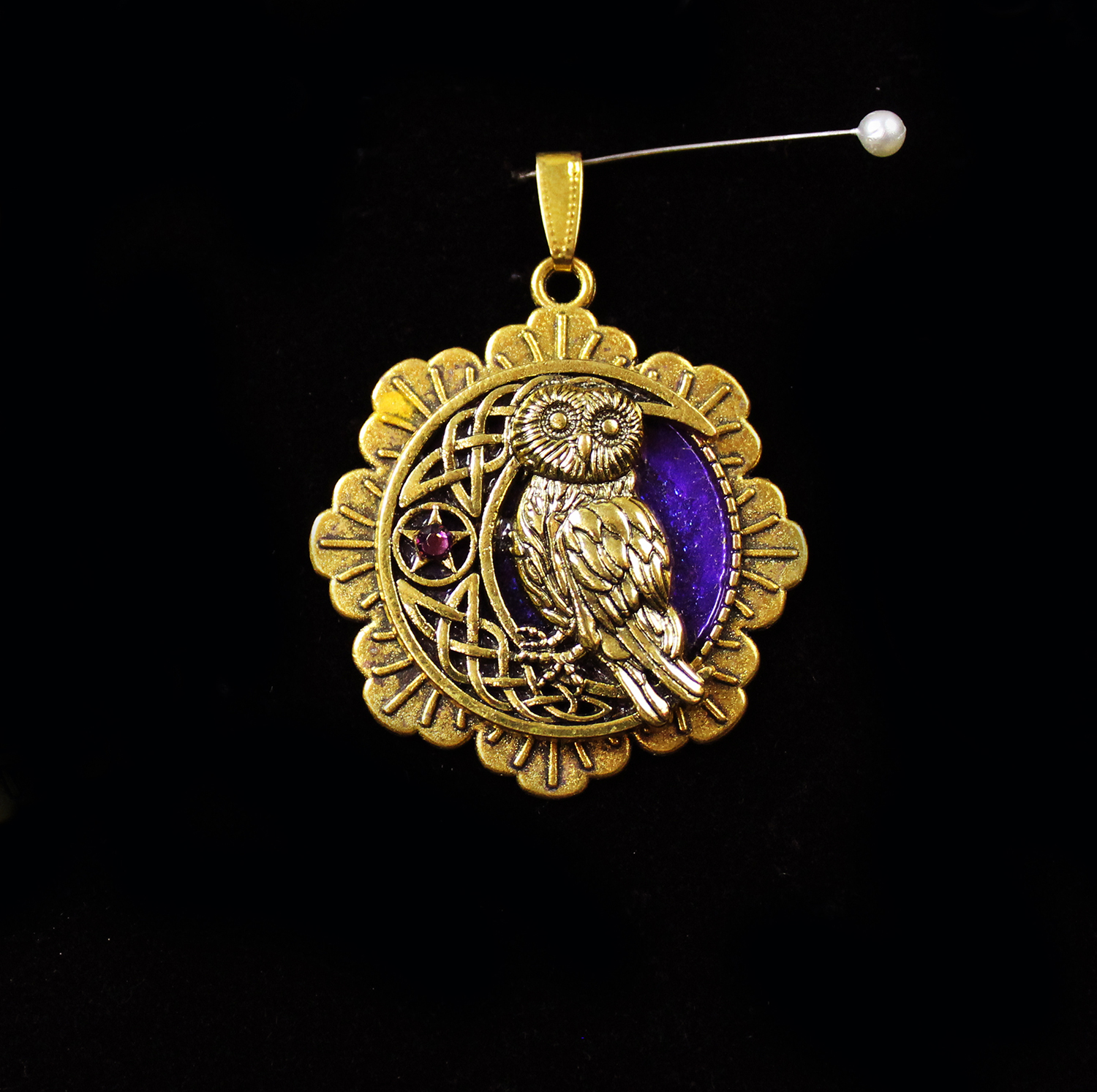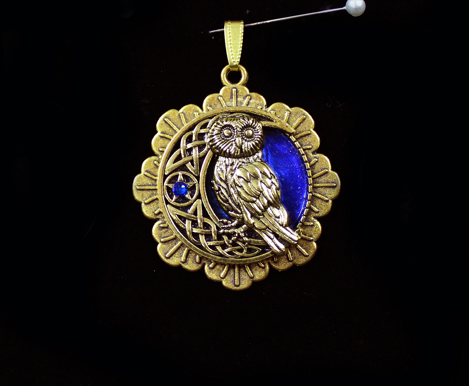 Owl and Crescent Moon in Gold and Multicolor (pendant)