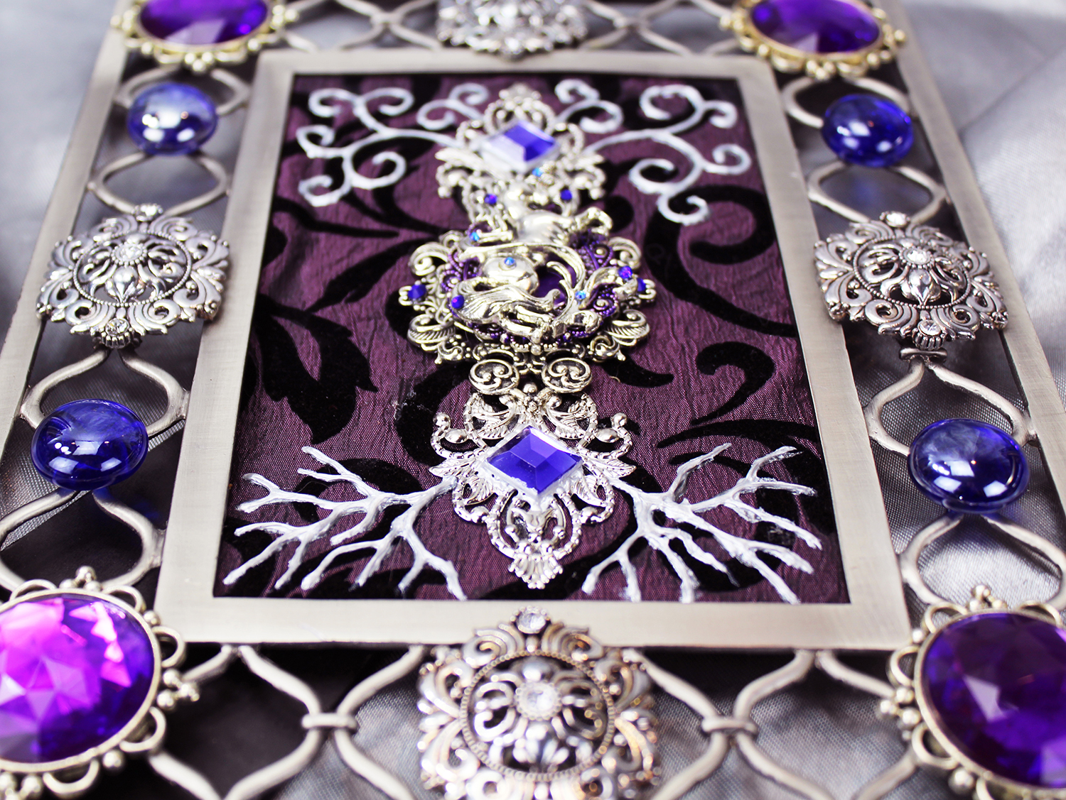Gold and silver paint, tissue paper, acrylics, watercolors, textured paper, jewels, charms, metal objects.