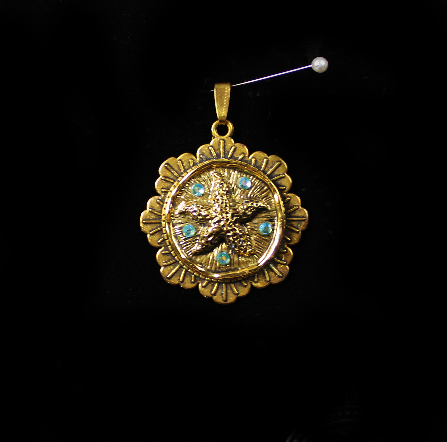 Gold and silver paint, tissue paper, acrylics, watercolors, textured paper, jewels, charms, metal objects.