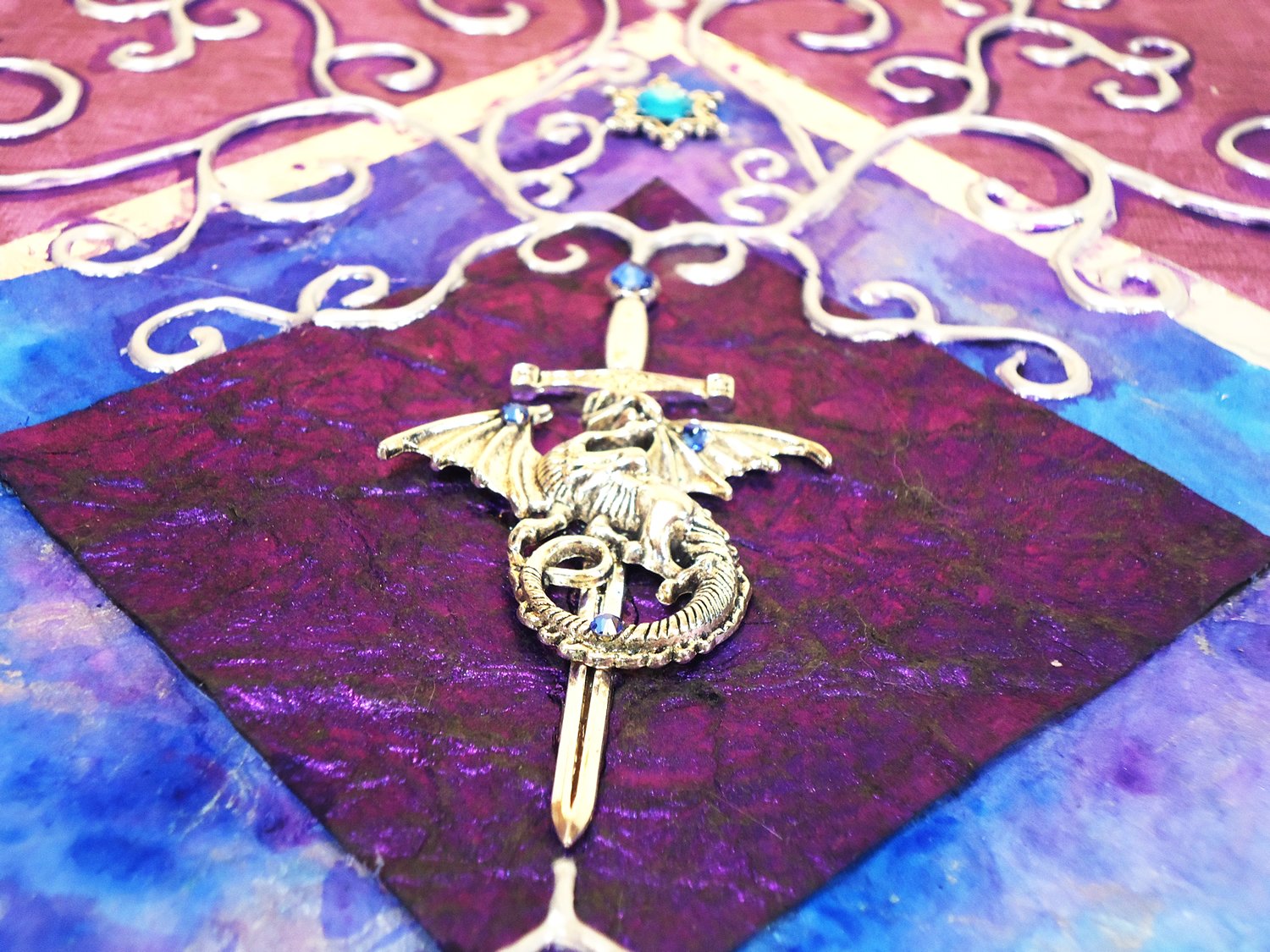 This elegant piece features a silver unicorn, dragon and sword, feather, and wing embellishments.