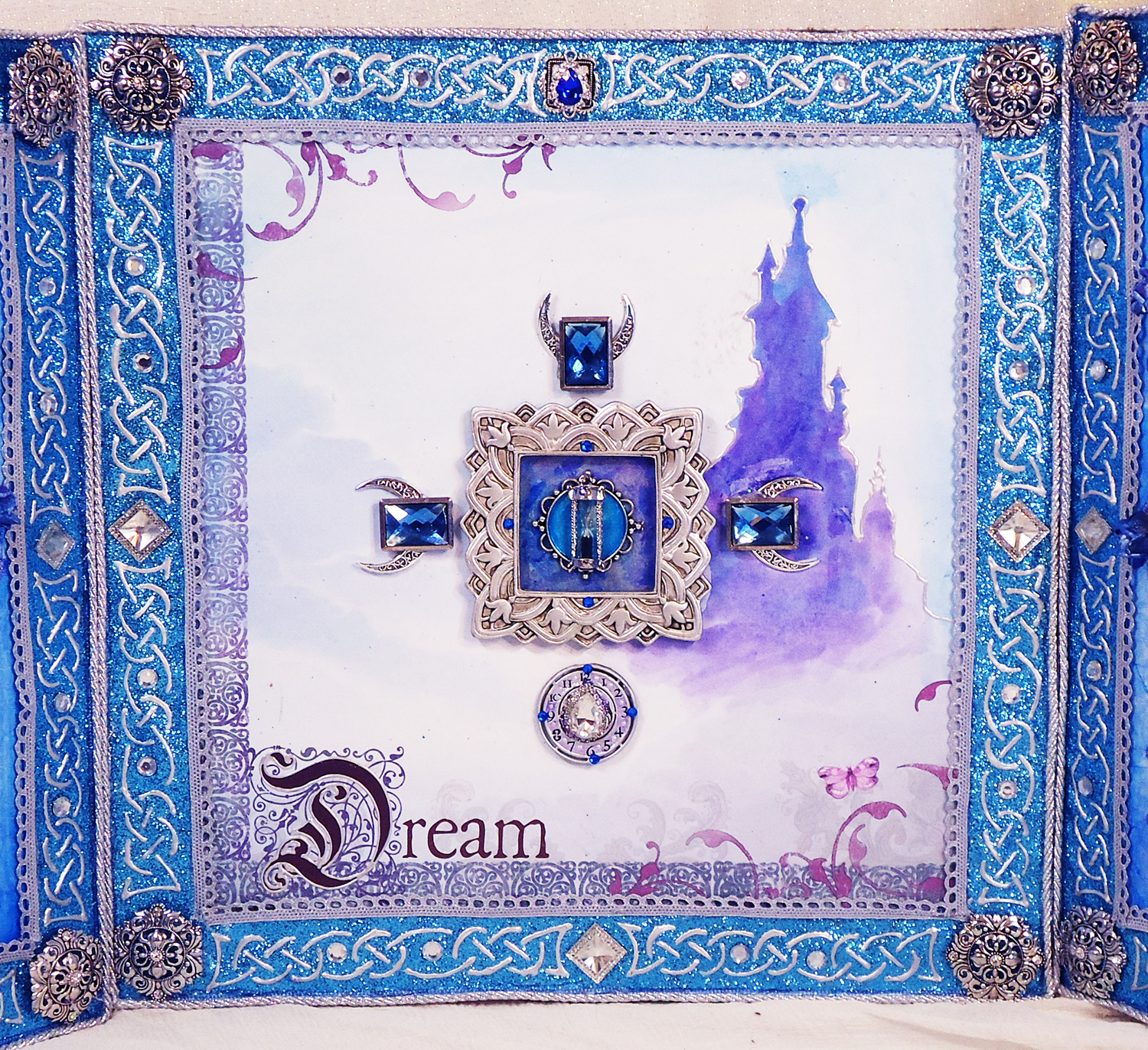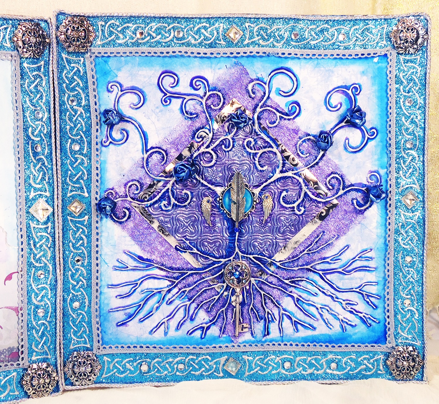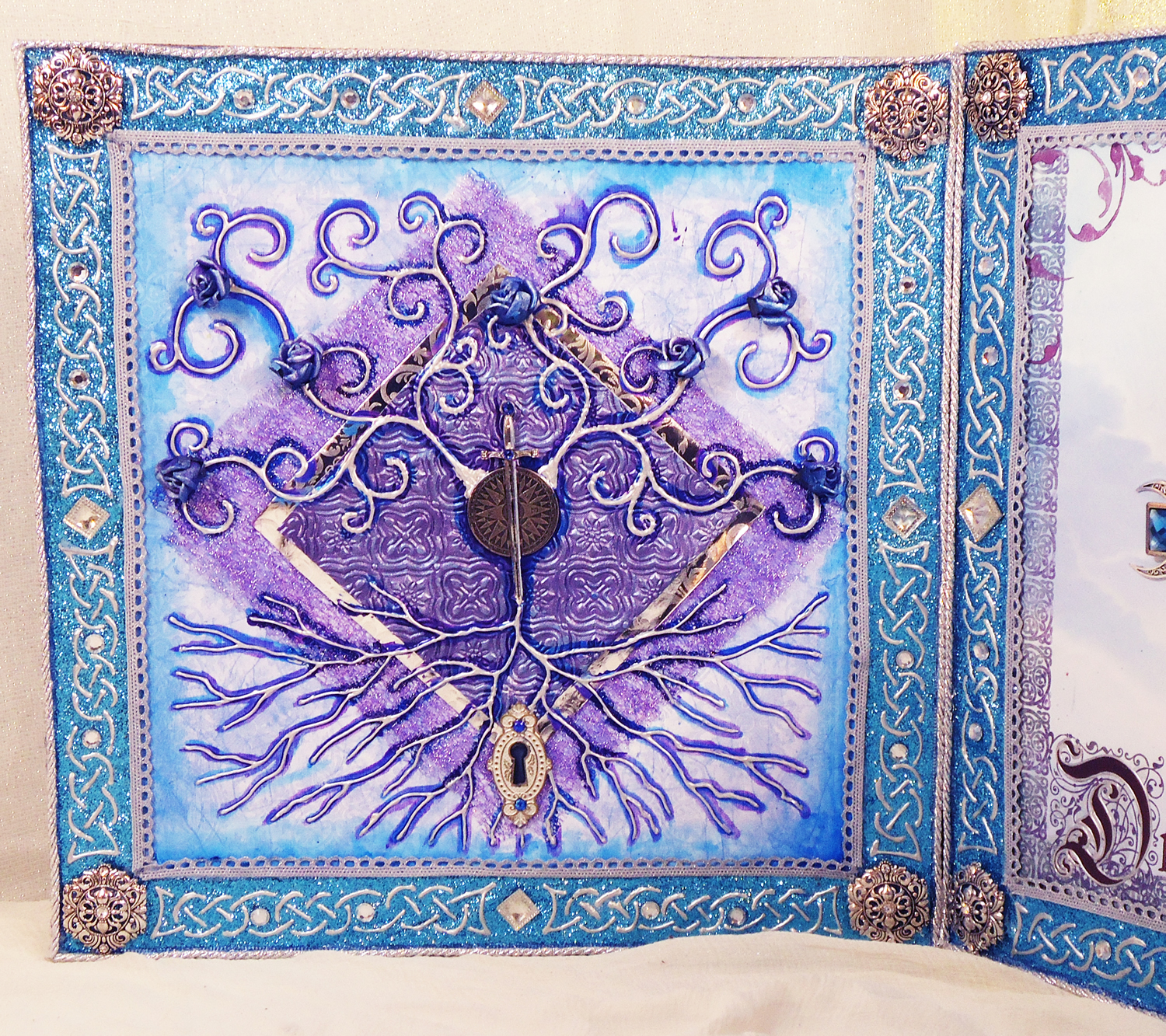 I’m pleased to offer hand-painted mixed media fairytale panels. Each individual square is 15” x 15” and these pieces can be displayed as a freestanding folding triptych on a table, or as three separate paintings hung on a wall. These lavishly decorated fairytale pieces feature metallic paint, textured fabric and paper, and embellishments such as keys, keyholes, functioning book lockets, hourglasses, and more.