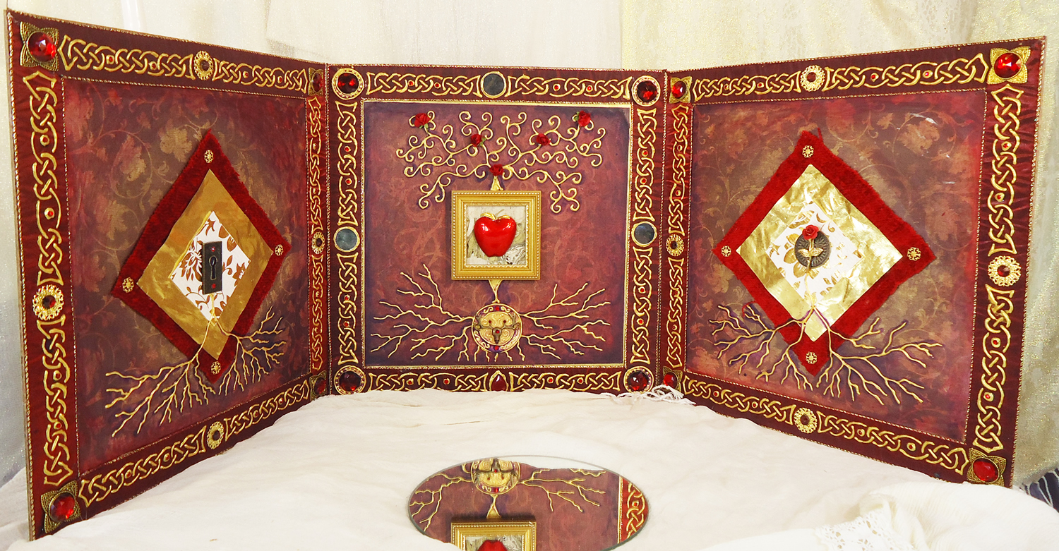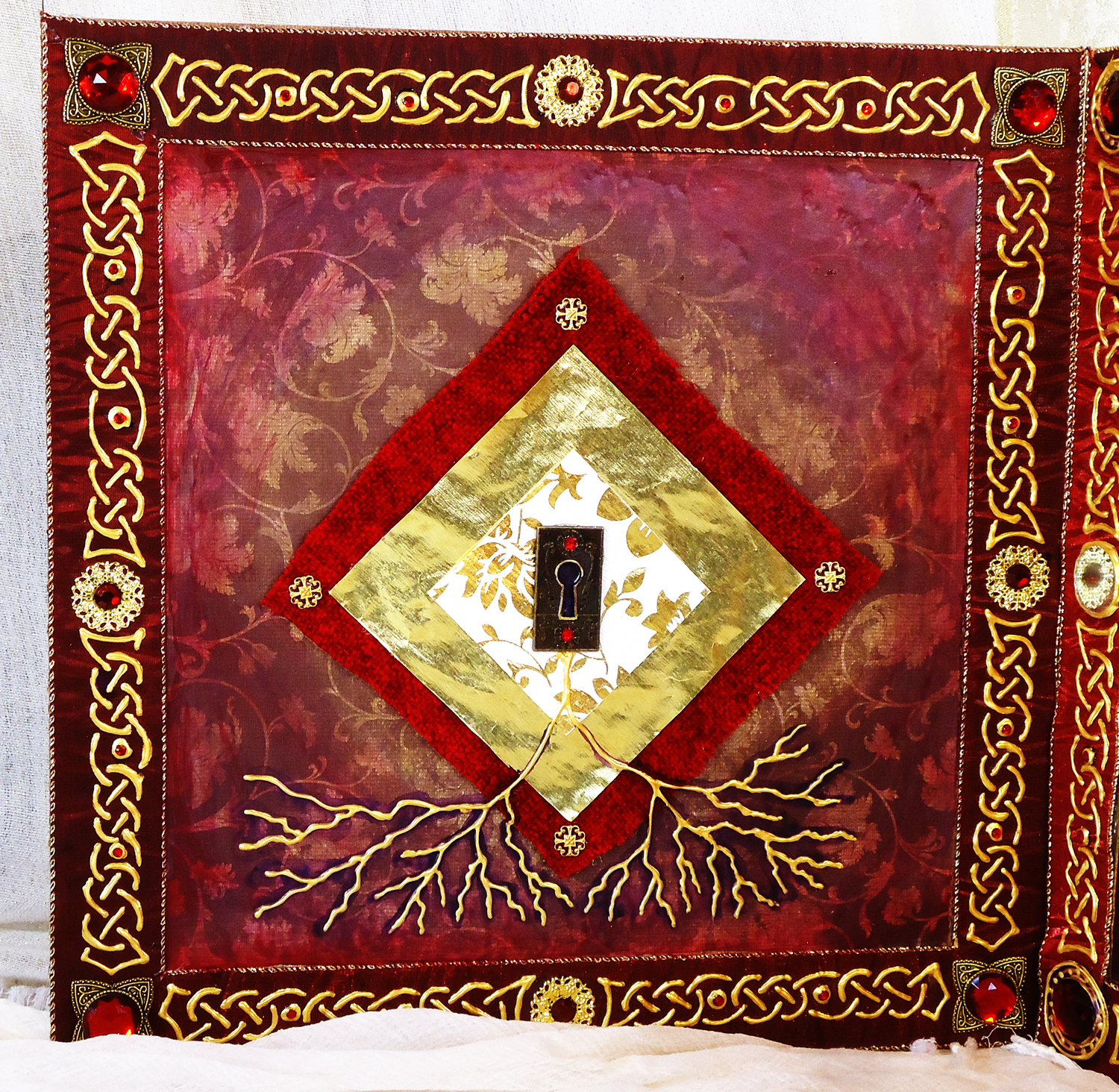 I’m pleased to offer hand-painted mixed media fairytale panels. Each individual square is 15” x 15” and these pieces can be displayed as a freestanding folding triptych on a table, or as three separate paintings hung on a wall. These lavishly decorated fairytale pieces feature metallic paint, textured fabric and paper, and embellishments such as keys, keyholes, functioning book lockets, hourglasses, and more.
