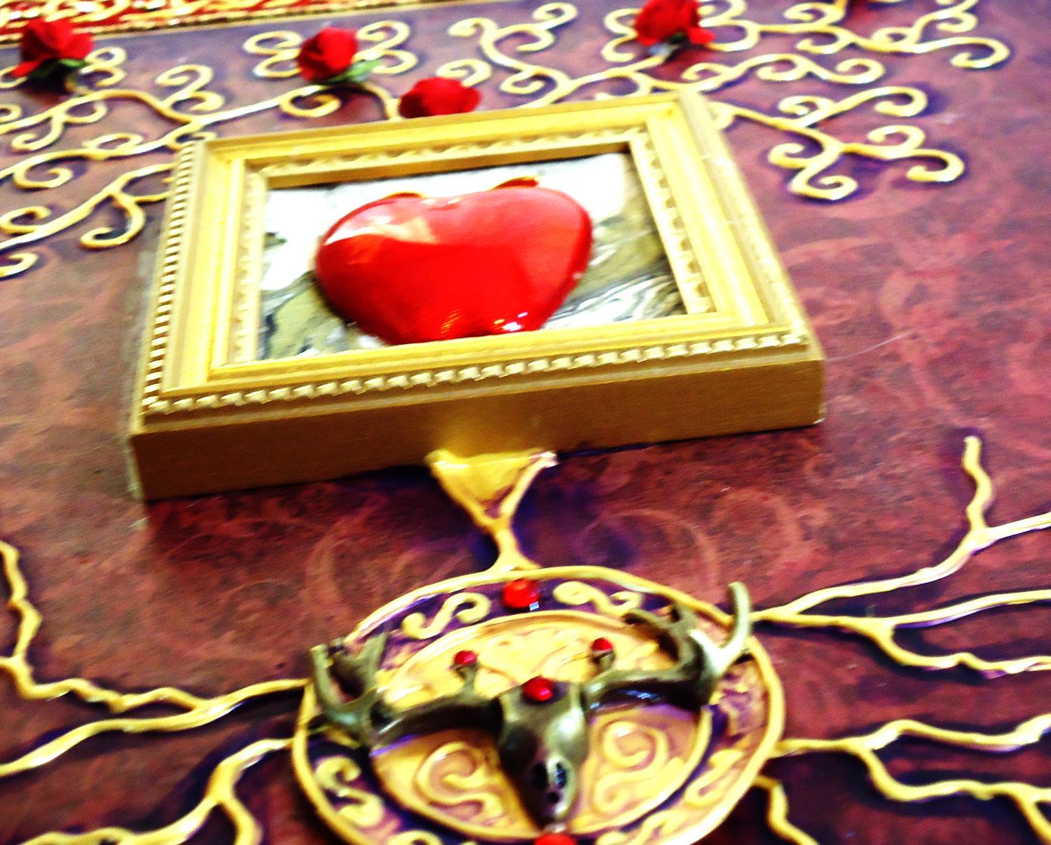 This elegant piece features a a metal rose, golden wings, red teardrop jewels, magic mirrors, stag and bird skull charms, as well as other embellishments.
