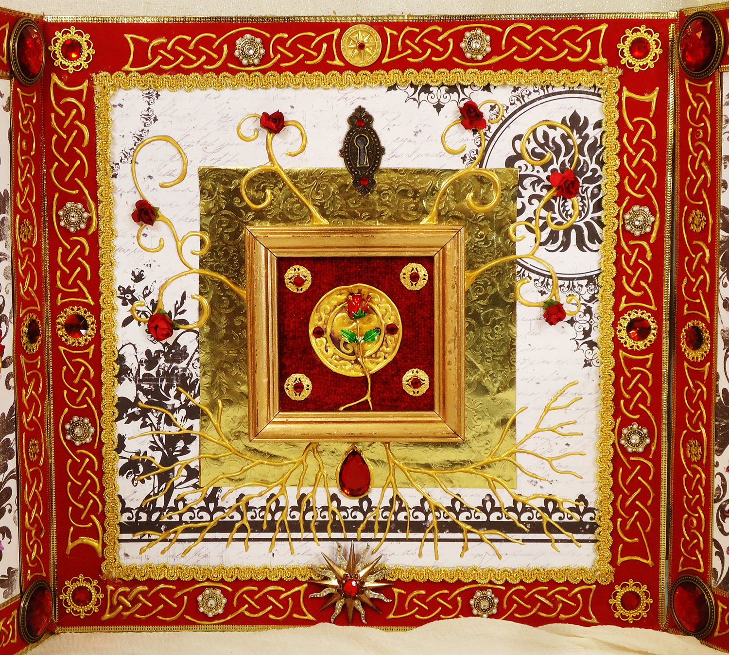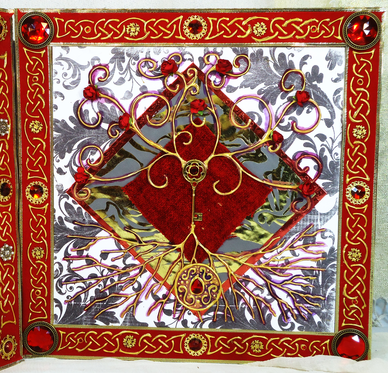 I’m pleased to offer hand-painted mixed media fairytale panels. Each individual square is 15” x 15” and these pieces can be displayed as a freestanding folding triptych on a table, or as three separate paintings hung on a wall. These lavishly decorated fairytale pieces feature metallic paint, textured fabric and paper, and embellishments such as keys, keyholes, functioning book lockets, hourglasses, and more.