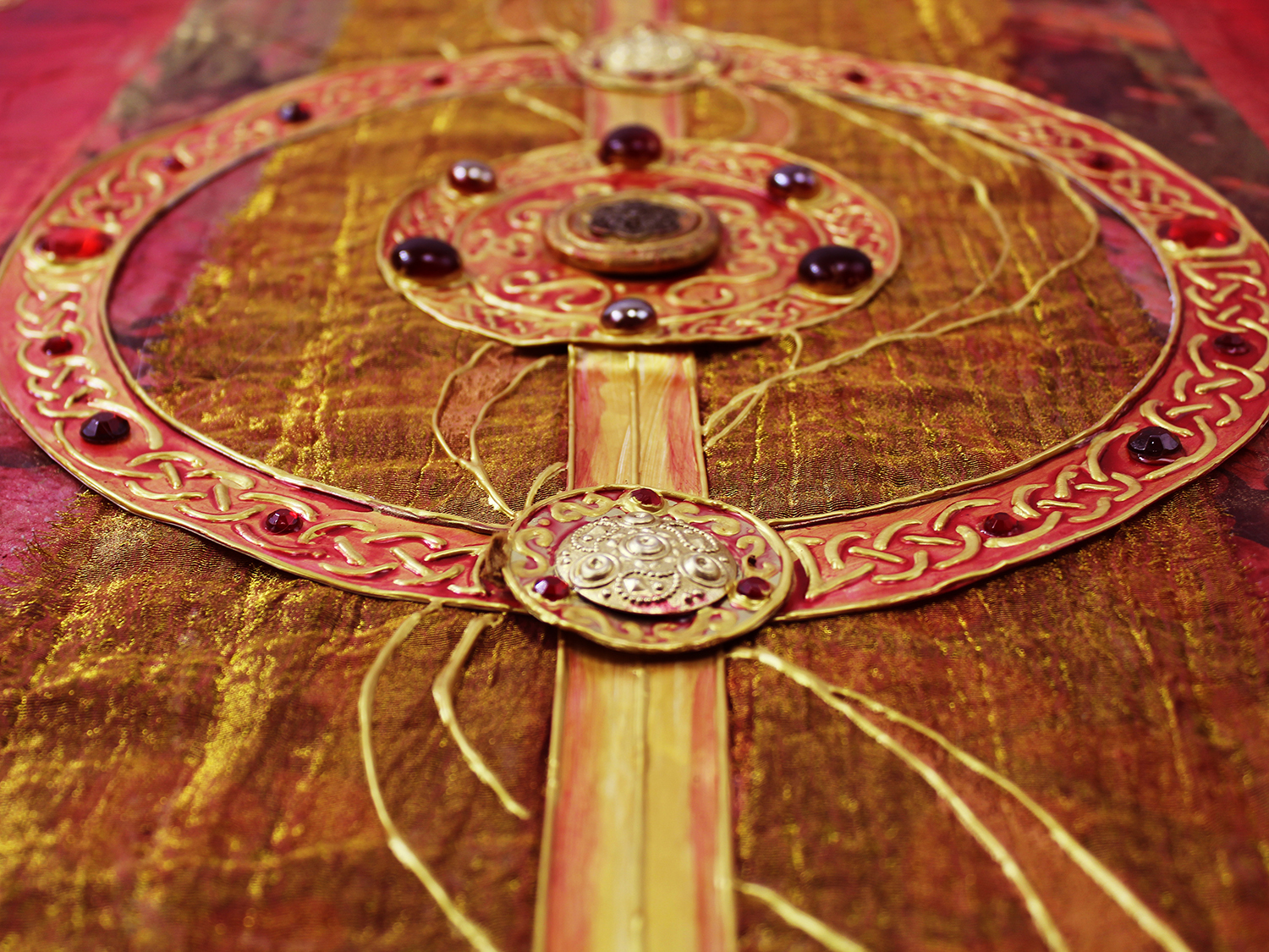 Gold and silver paint, tissue paper, acrylics, watercolors, textured paper, jewels, charms, metal objects.