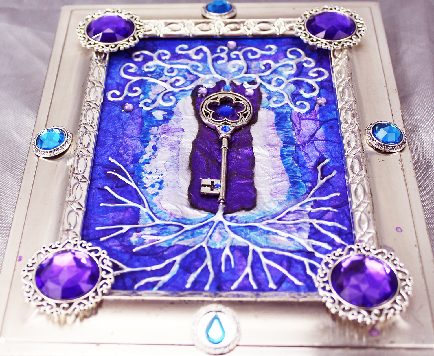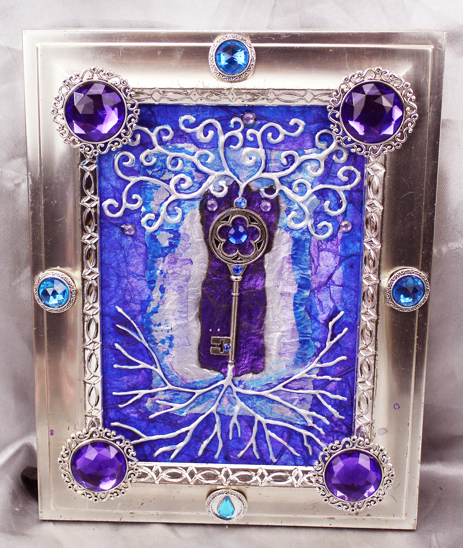 Gold and silver paint, tissue paper, acrylics, watercolors, textured paper, jewels, charms, metal objects.