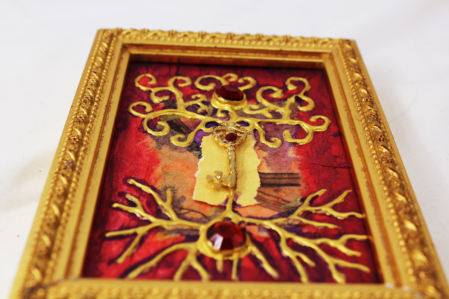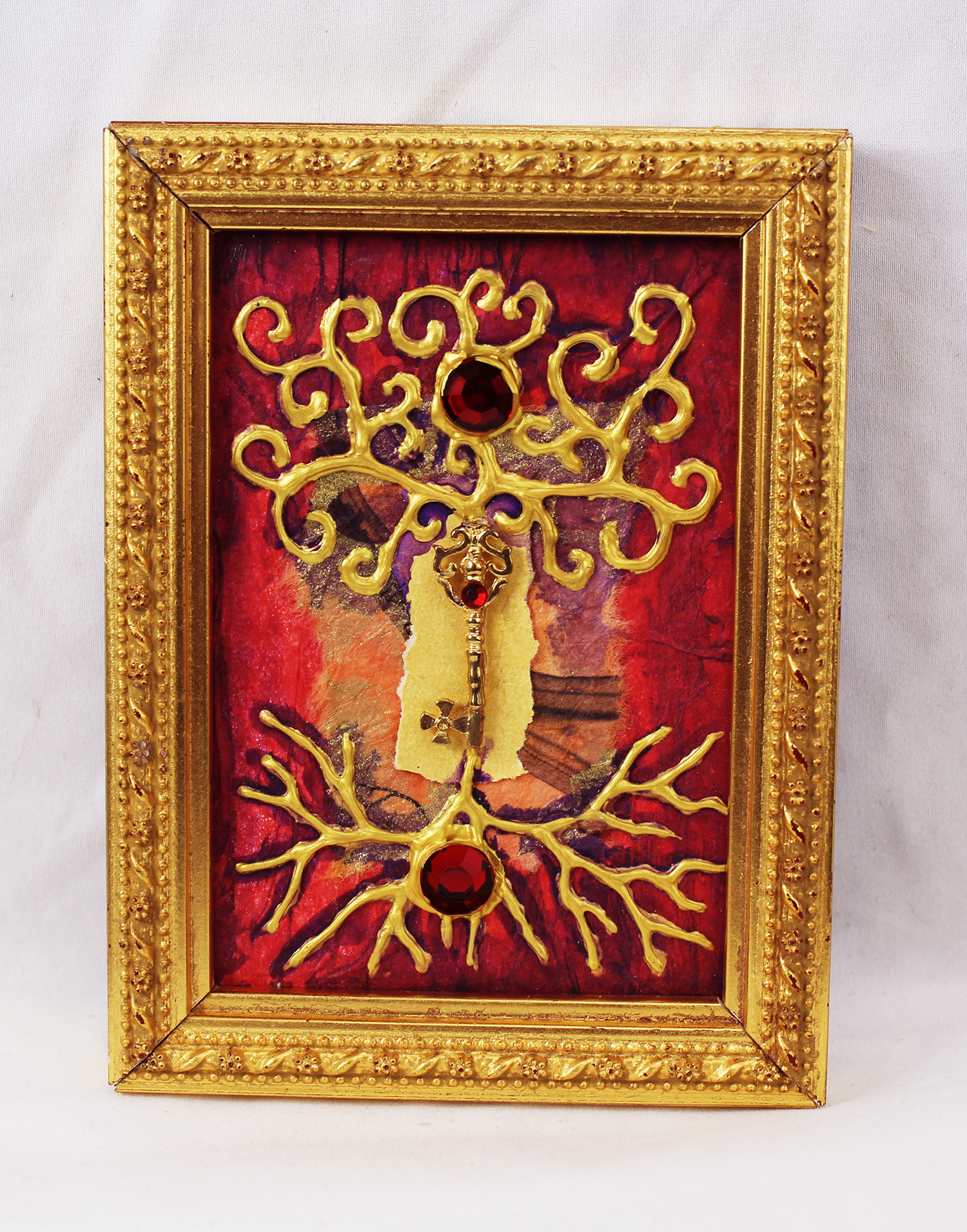 Gold and silver paint, tissue paper, acrylics, watercolors, textured paper, jewels, charms, metal objects.