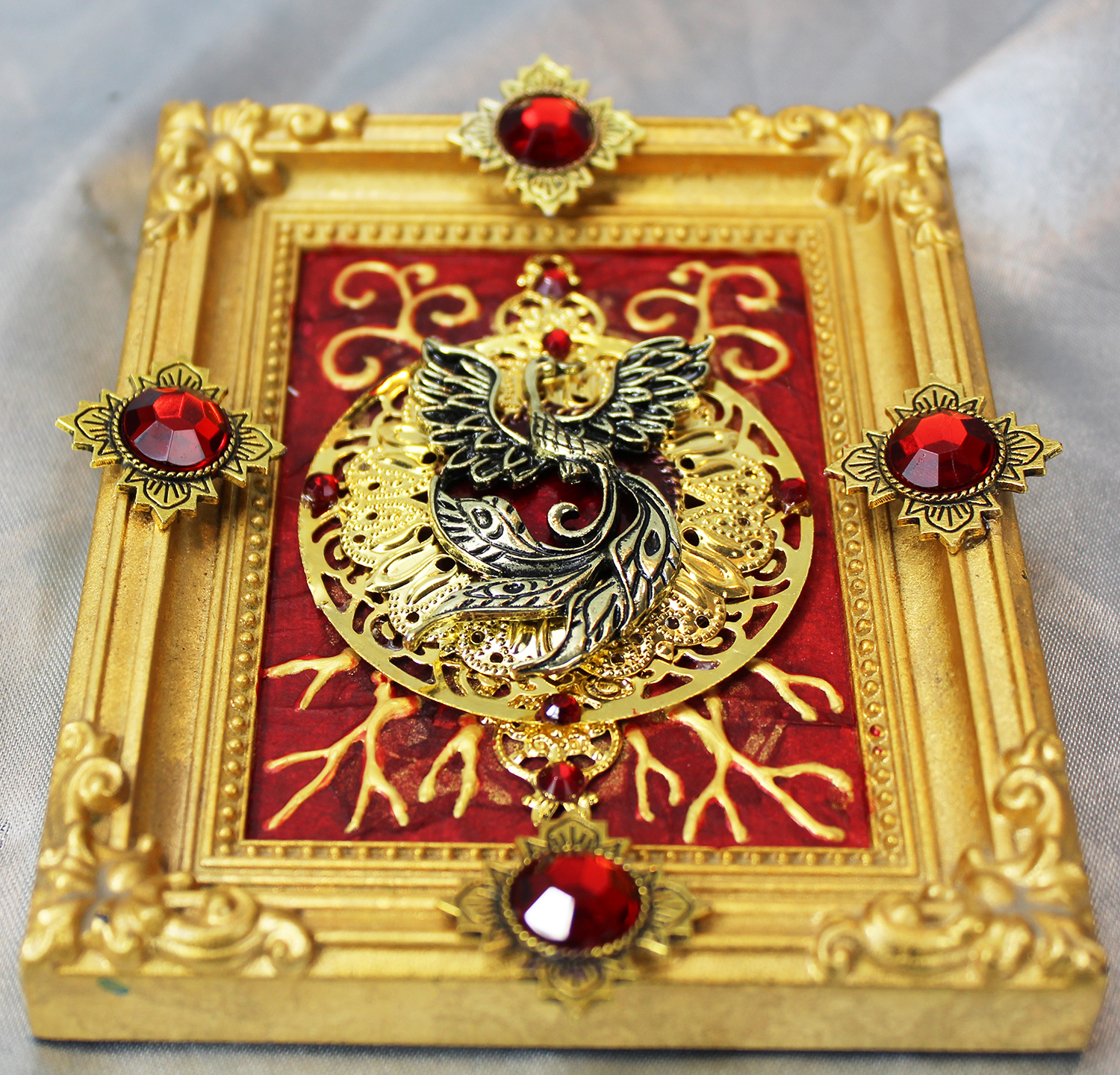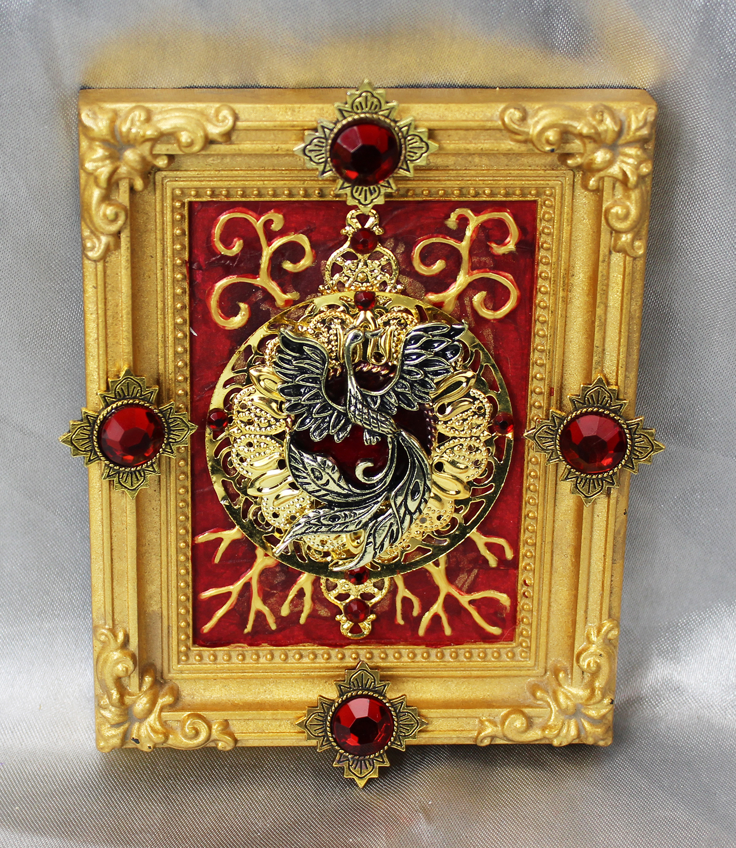 Gold and silver paint, tissue paper, acrylics, watercolors, textured paper, jewels, charms, metal objects.