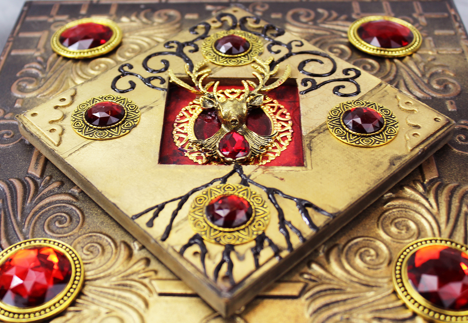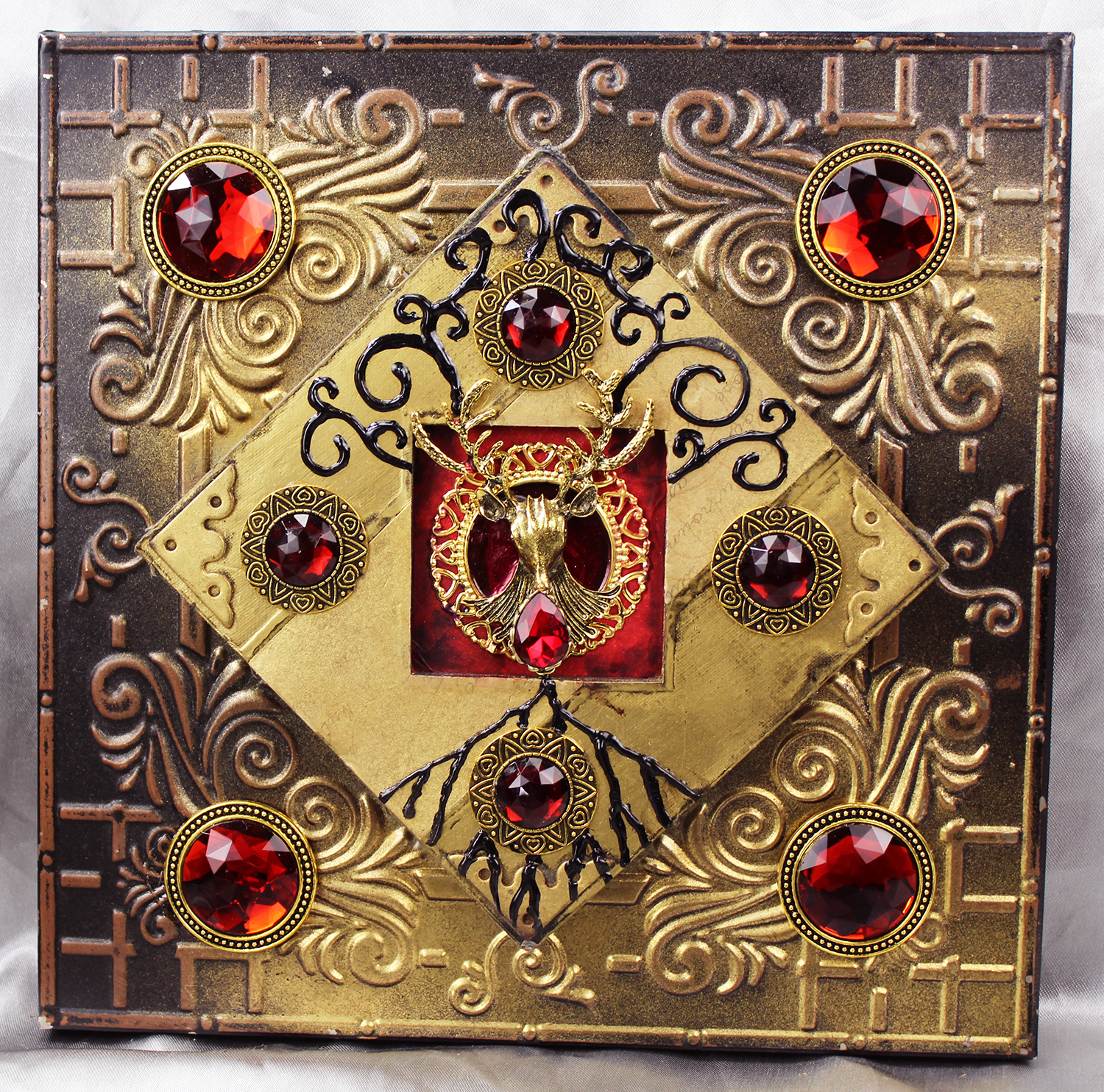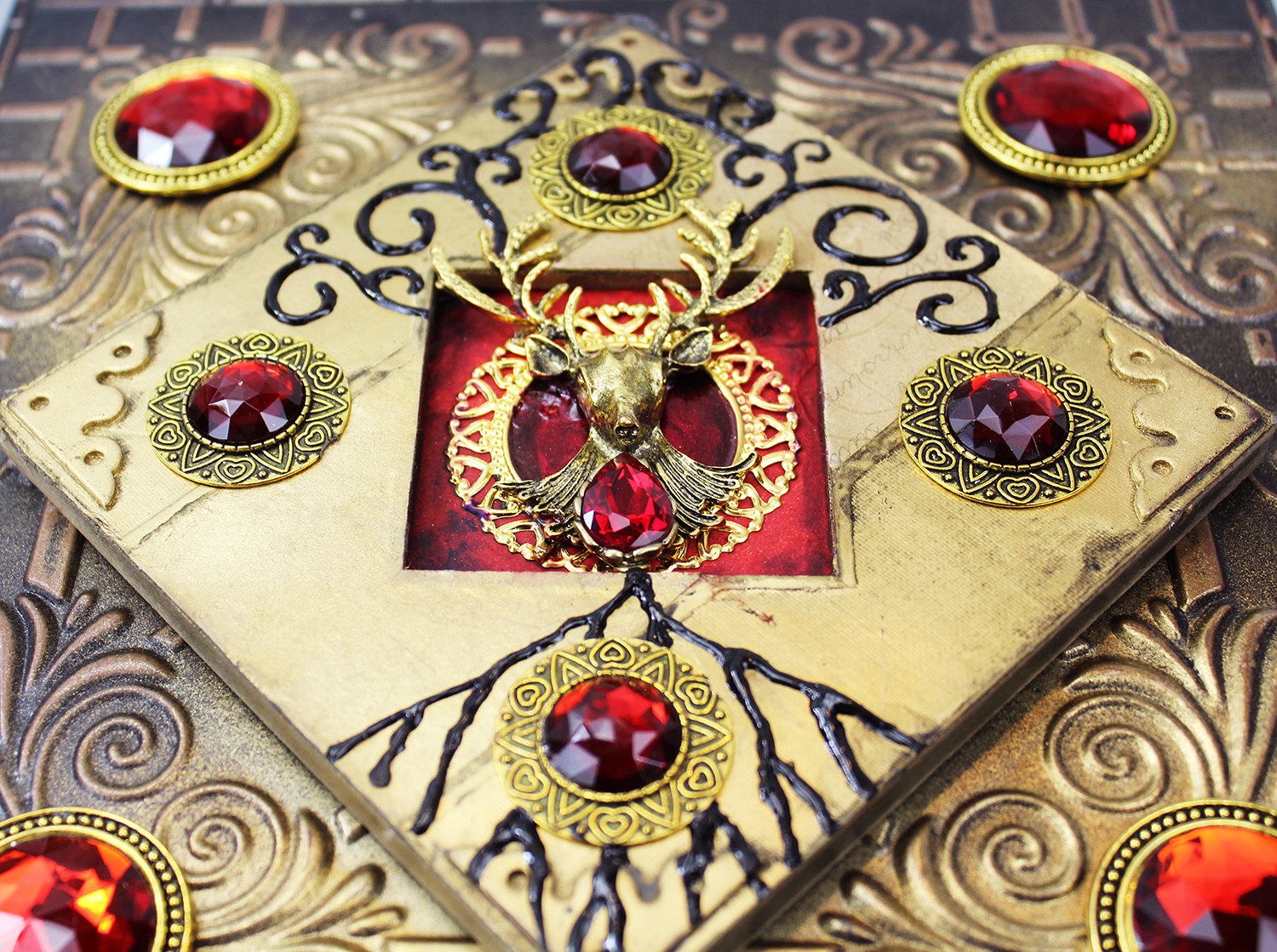Gold and silver paint, tissue paper, acrylics, watercolors, textured paper, jewels, charms, metal objects.