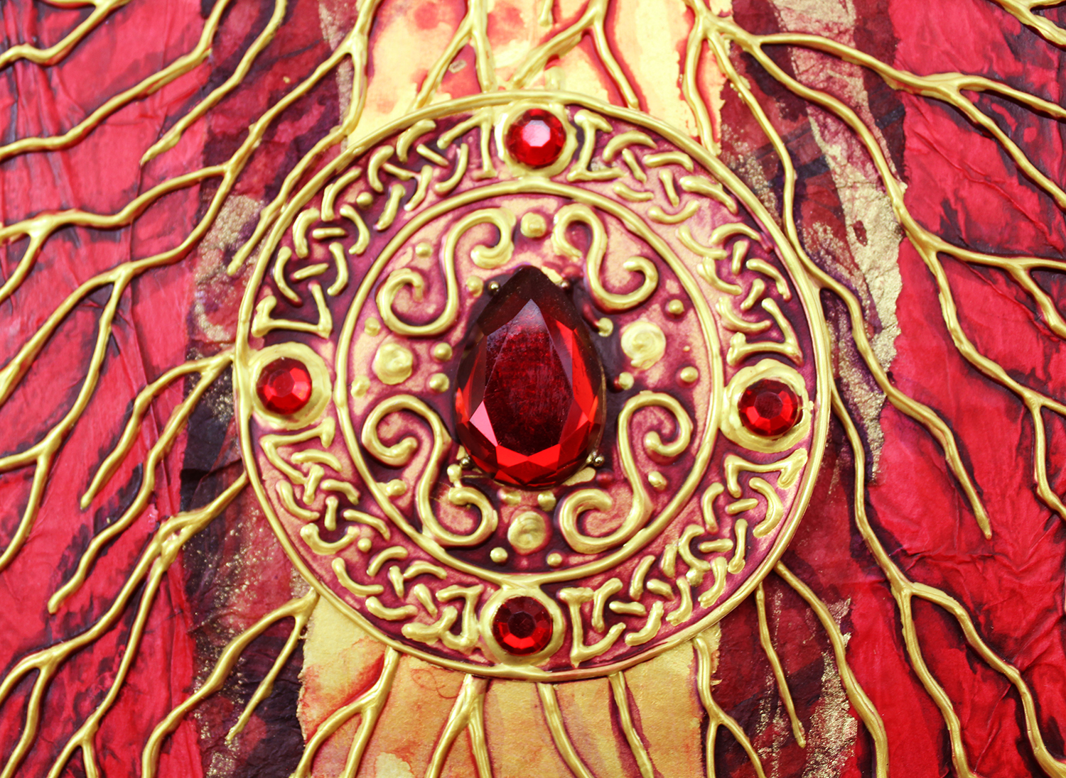 Gold and silver paint, tissue paper, acrylics, watercolors, textured paper, jewels, charms, metal objects.