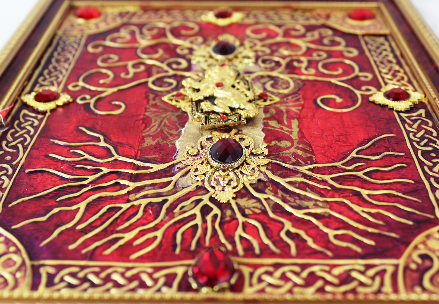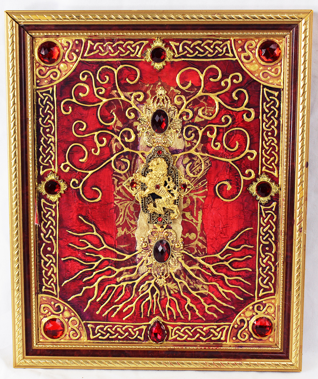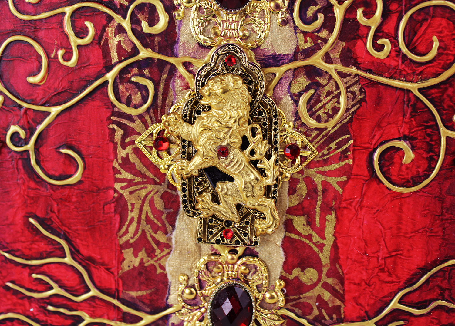 Gold and silver paint, tissue paper, acrylics, watercolors, textured paper, jewels, charms, metal objects.
