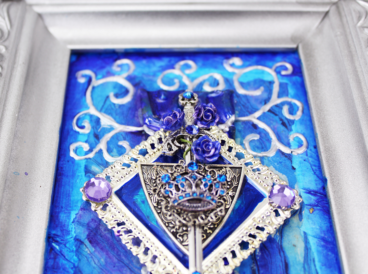 Gold and silver paint, tissue paper, acrylics, watercolors, textured paper, jewels, charms, metal objects.