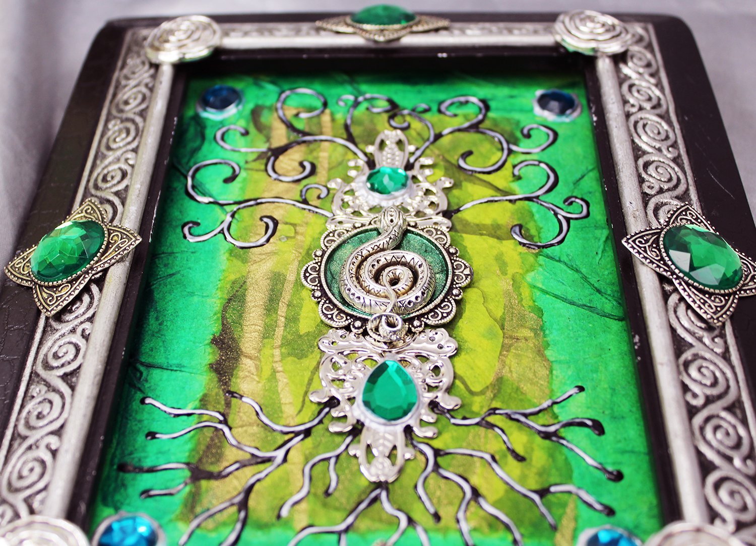Gold and silver paint, tissue paper, acrylics, watercolors, textured paper, jewels, charms, metal objects.