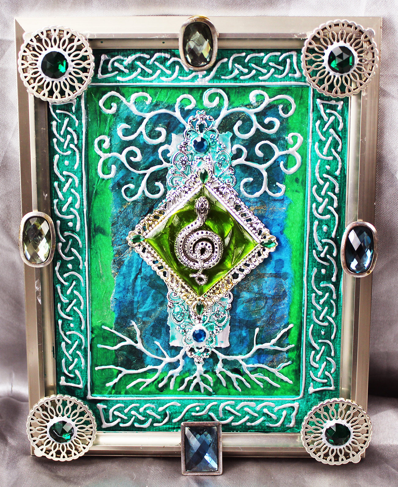 Gold and silver paint, tissue paper, acrylics, watercolors, textured paper, jewels, charms, metal objects.