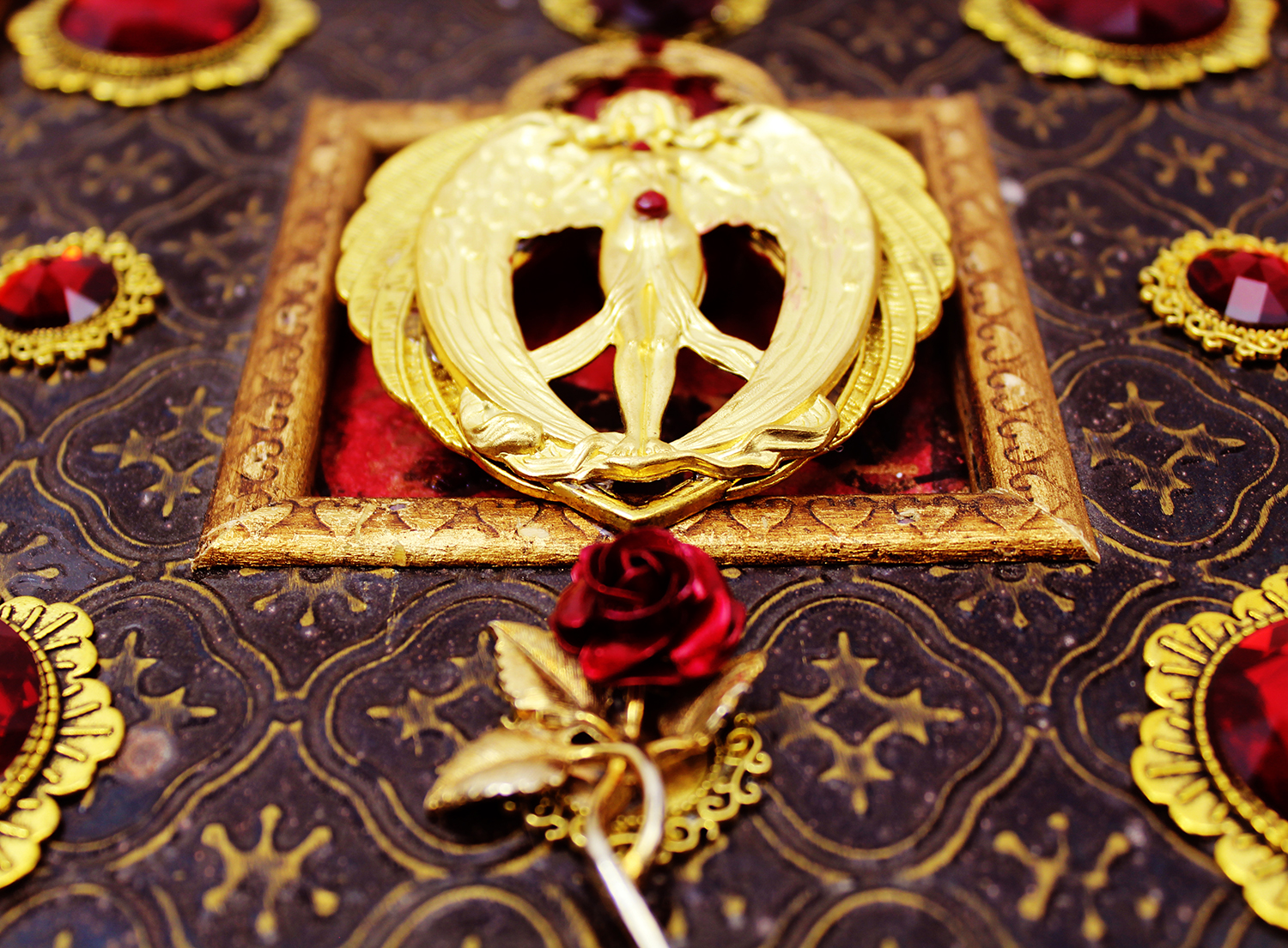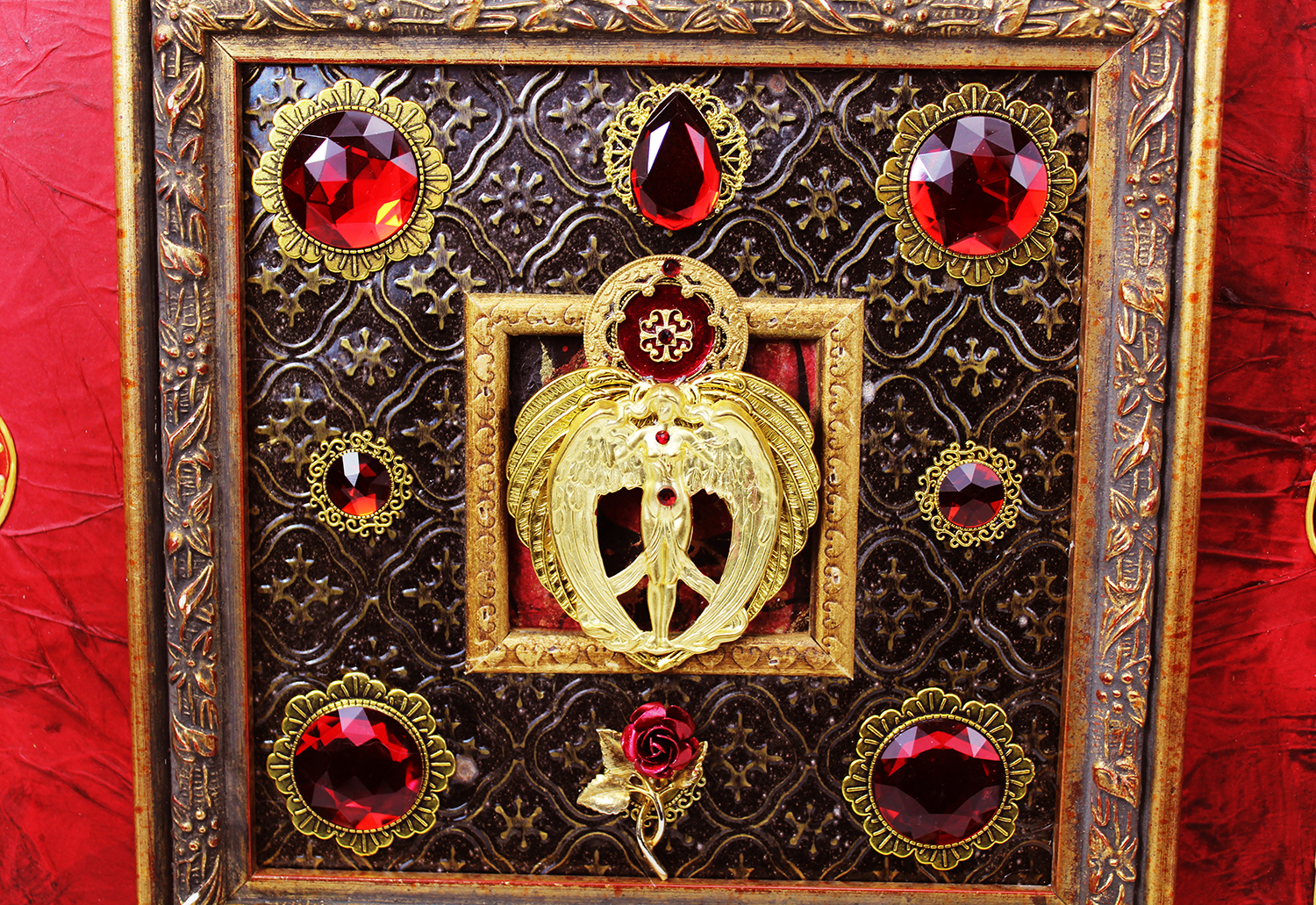 Gold and silver paint, tissue paper, acrylics, watercolors, textured paper, jewels, charms, metal objects.