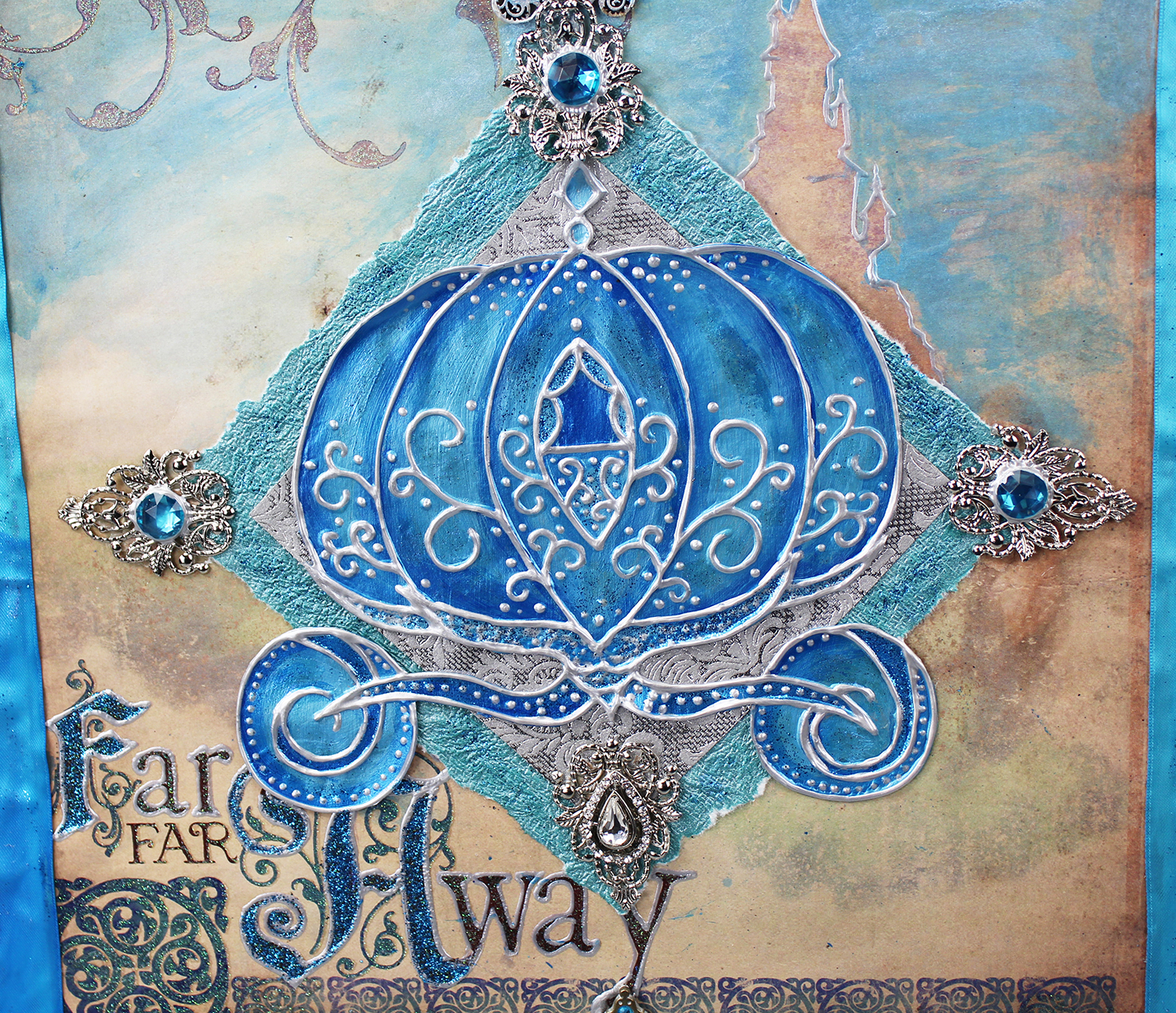 Gold and silver paint, tissue paper, acrylics, watercolors, textured paper, jewels, charms, metal objects.