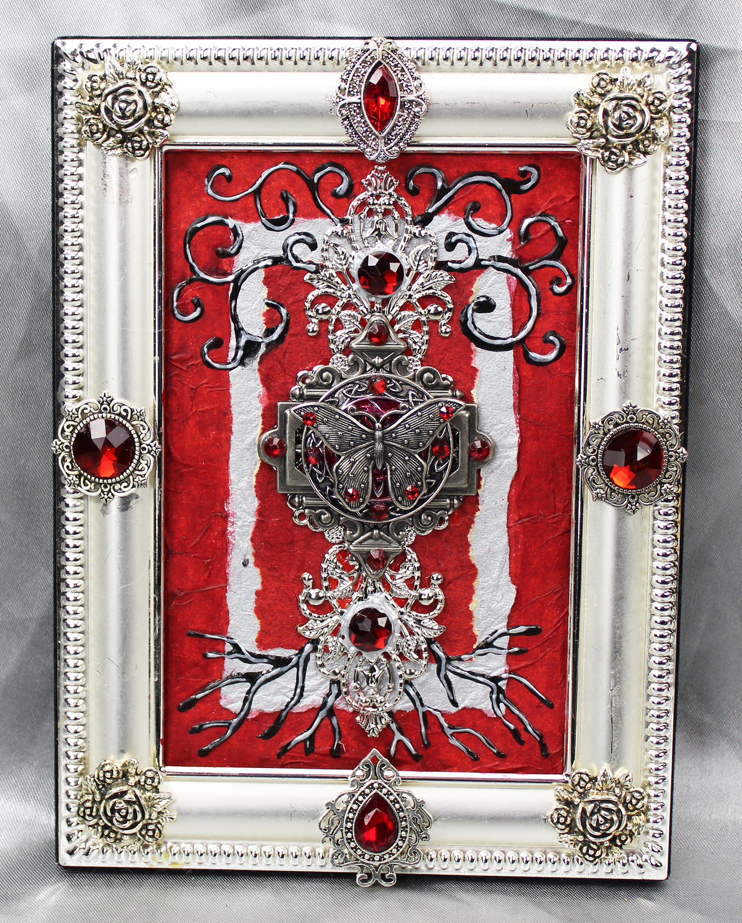 Gold and silver paint, tissue paper, acrylics, watercolors, textured paper, jewels, charms, metal objects.