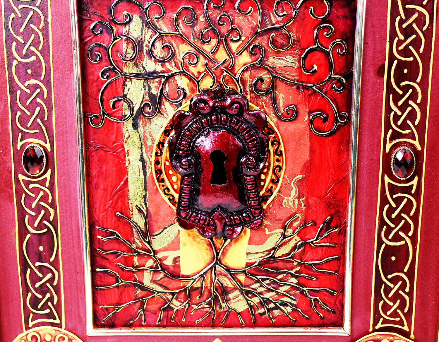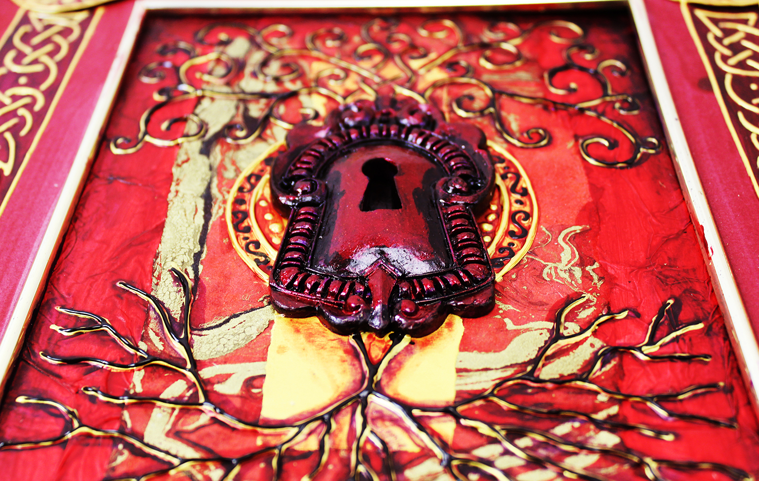 Gold and silver paint, tissue paper, acrylics, watercolors, textured paper, jewels, charms, metal objects.