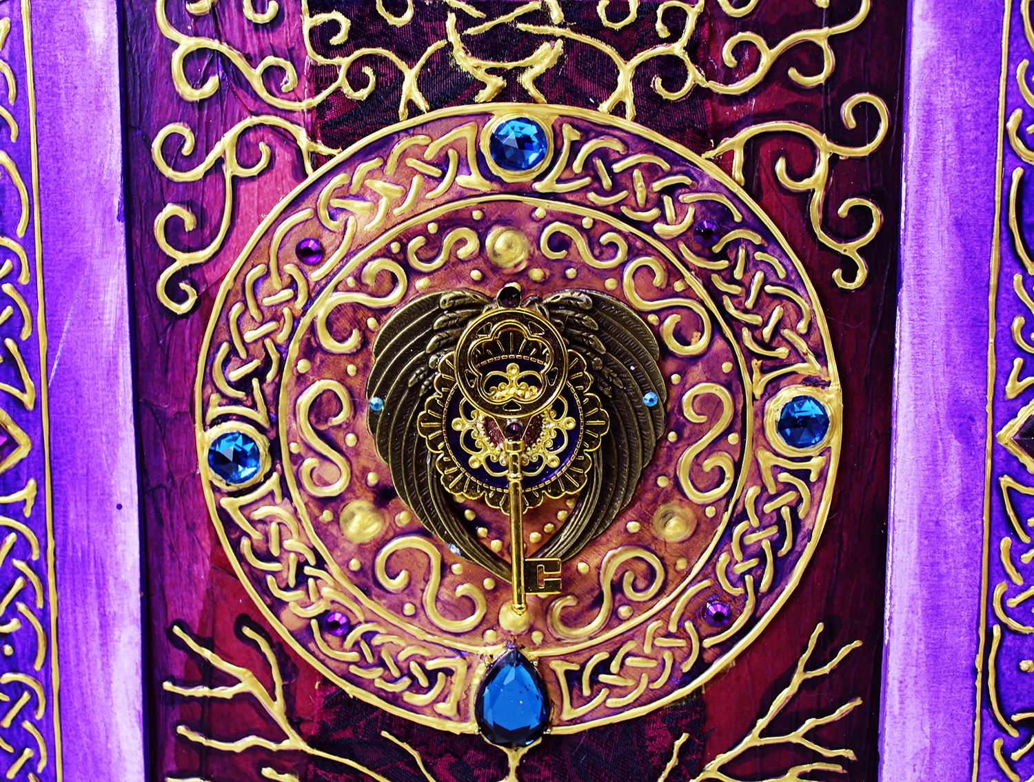 Gold and silver paint, tissue paper, acrylics, watercolors, textured paper, jewels, charms, metal objects.