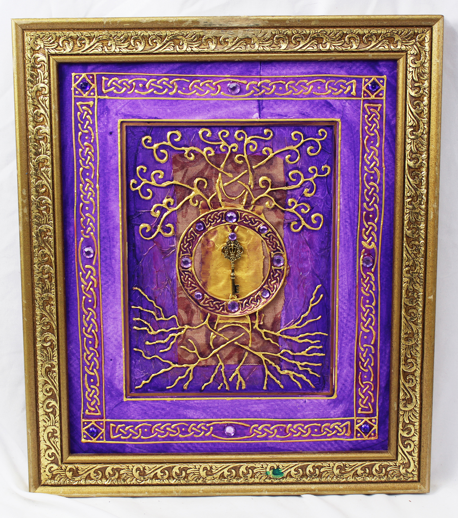 These pieces are created from layered and textured paint, paper, fabric, and other with raised gold or silver paint to create the design. The frame is included.