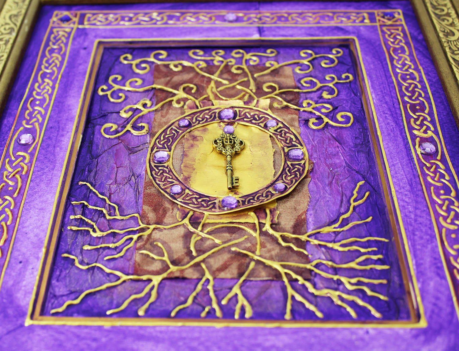 Gold and silver paint, tissue paper, acrylics, watercolors, textured paper, jewels, charms, metal objects.