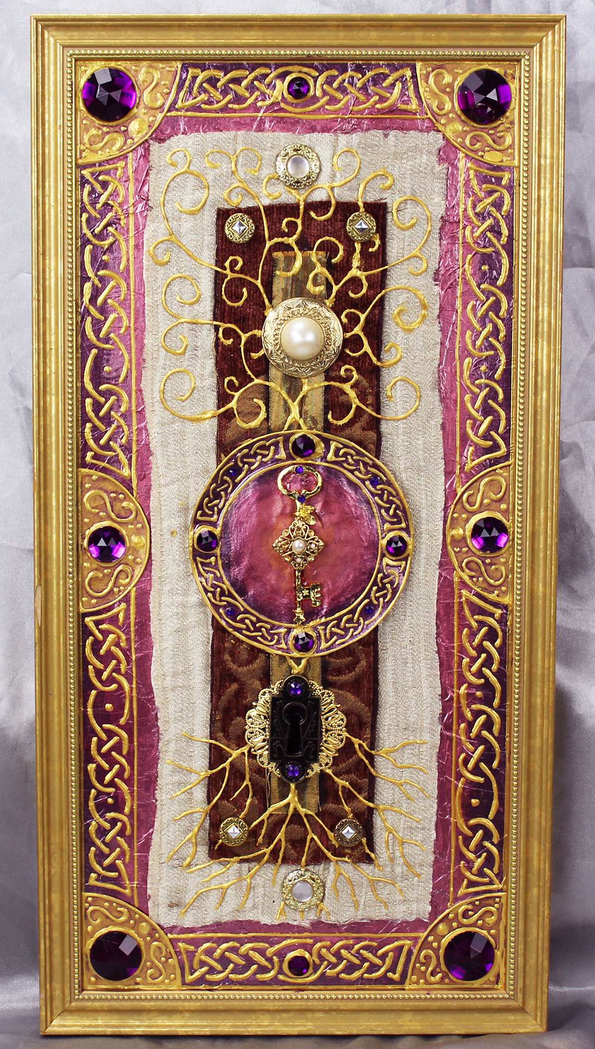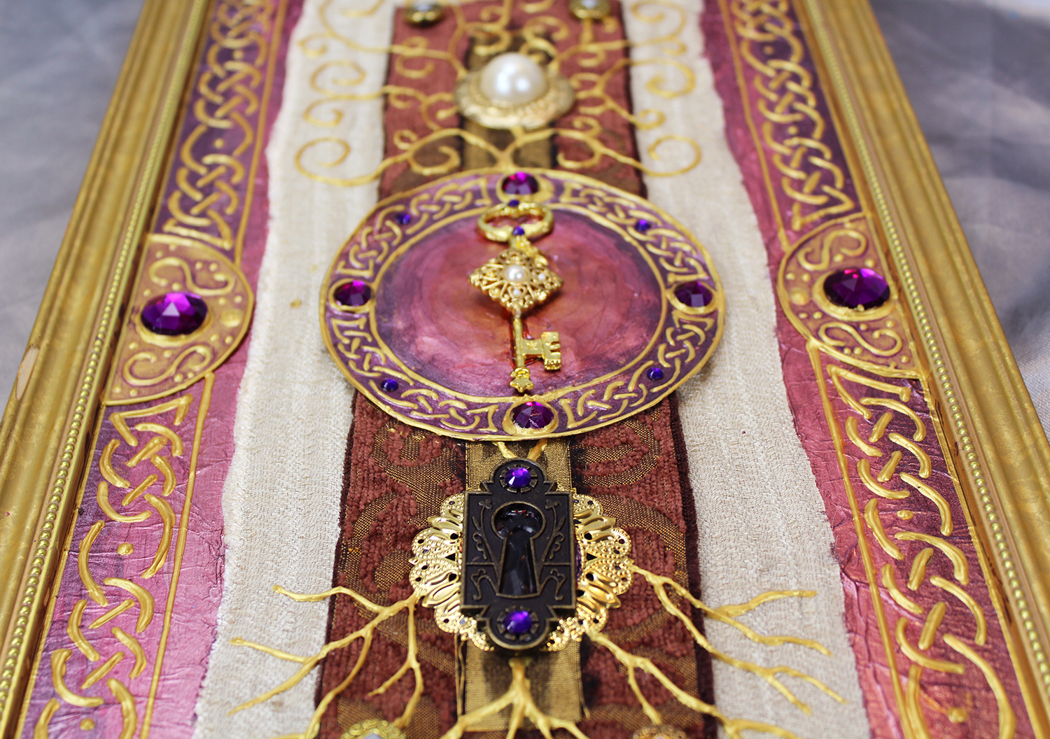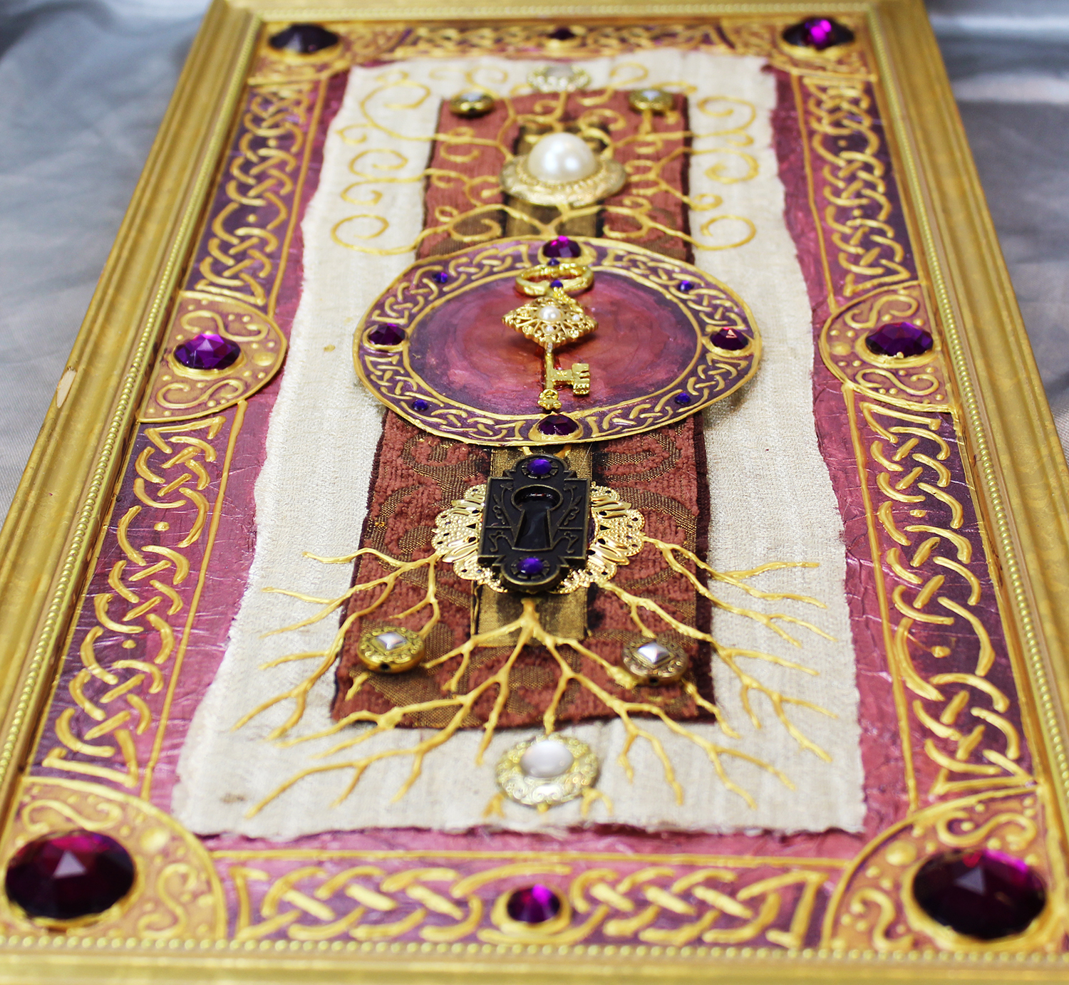 Gold and silver paint, tissue paper, acrylics, watercolors, textured paper, jewels, charms, metal objects.