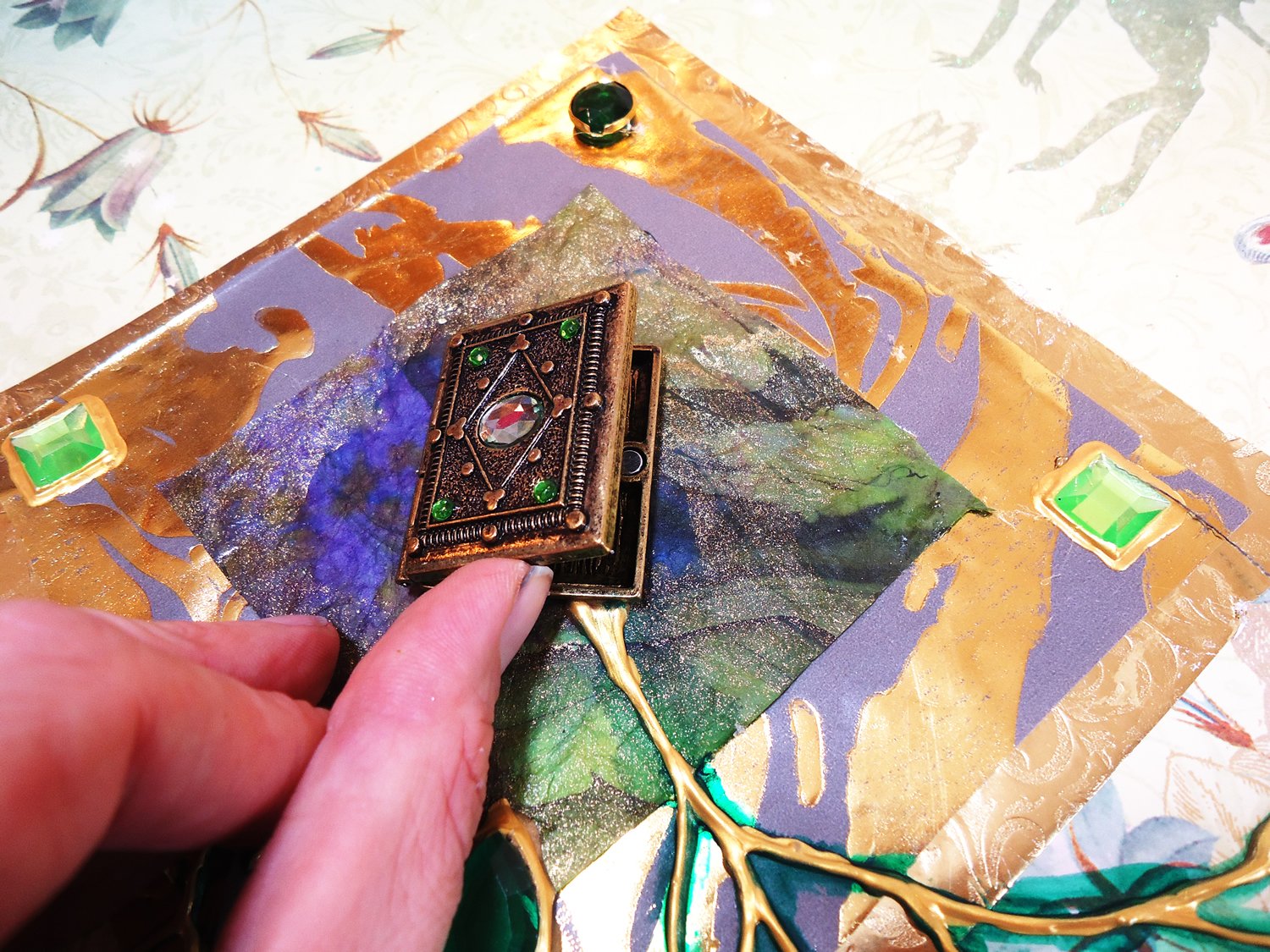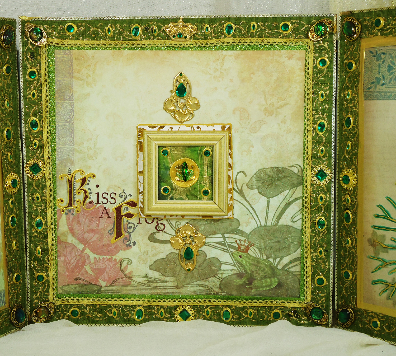 I’m pleased to offer hand-painted mixed media fairytale panels. Each individual square is 15” x 15” and these pieces can be displayed as a freestanding folding triptych on a table, or as three separate paintings hung on a wall. These lavishly decorated fairytale pieces feature metallic paint, textured fabric and paper, and embellishments such as keys, keyholes, functioning book lockets, hourglasses, and more.