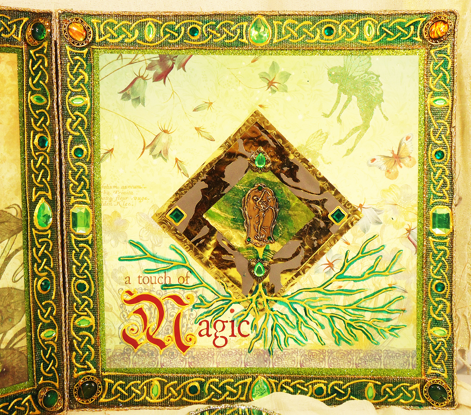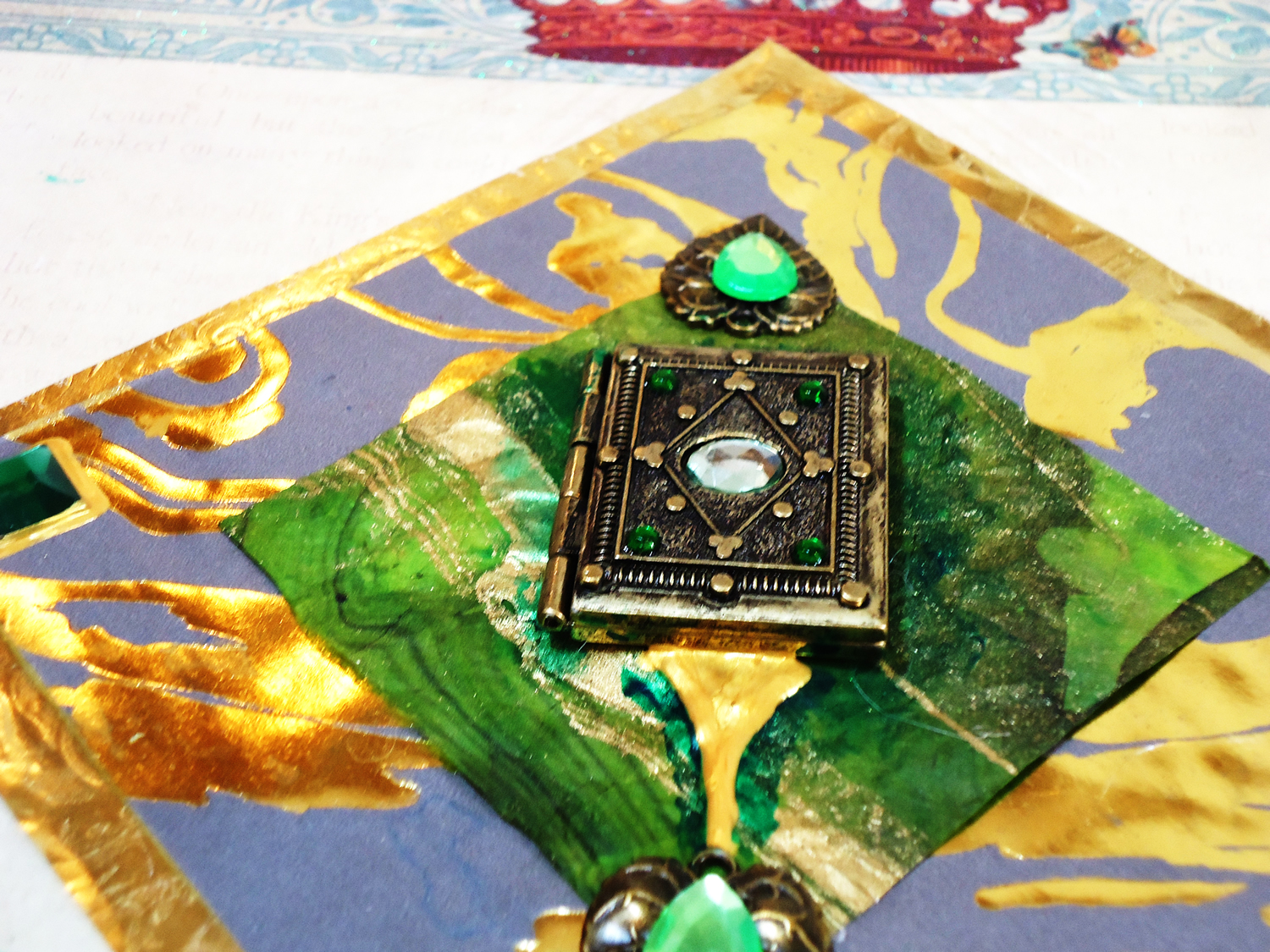I’m pleased to offer hand-painted mixed media fairytale panels. Each individual square is 15” x 15” and these pieces can be displayed as a freestanding folding triptych on a table, or as three separate paintings hung on a wall. These lavishly decorated fairytale pieces feature metallic paint, textured fabric and paper, and embellishments such as keys, keyholes, functioning book lockets, hourglasses, and more.