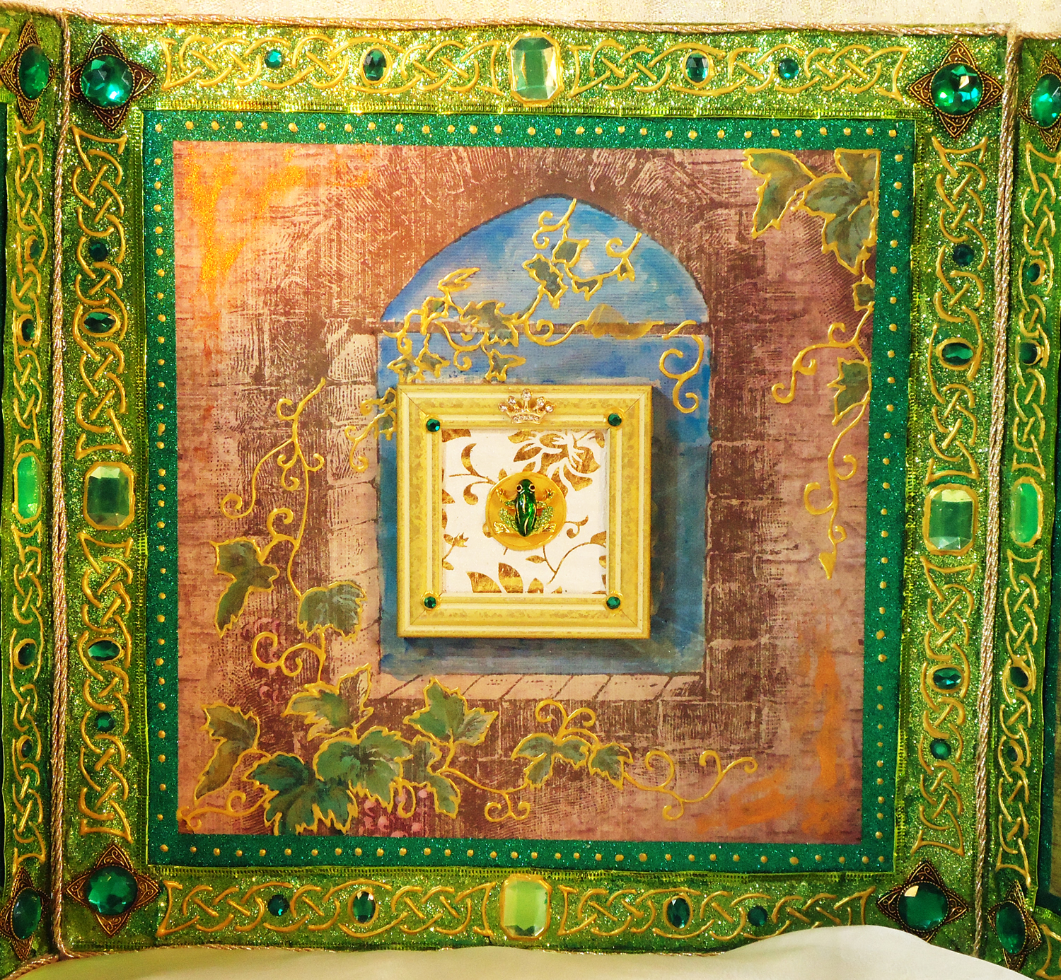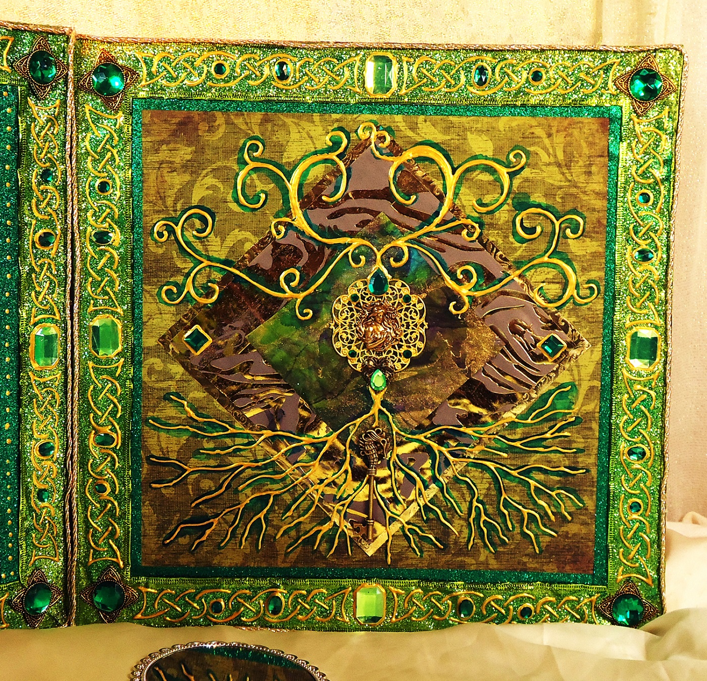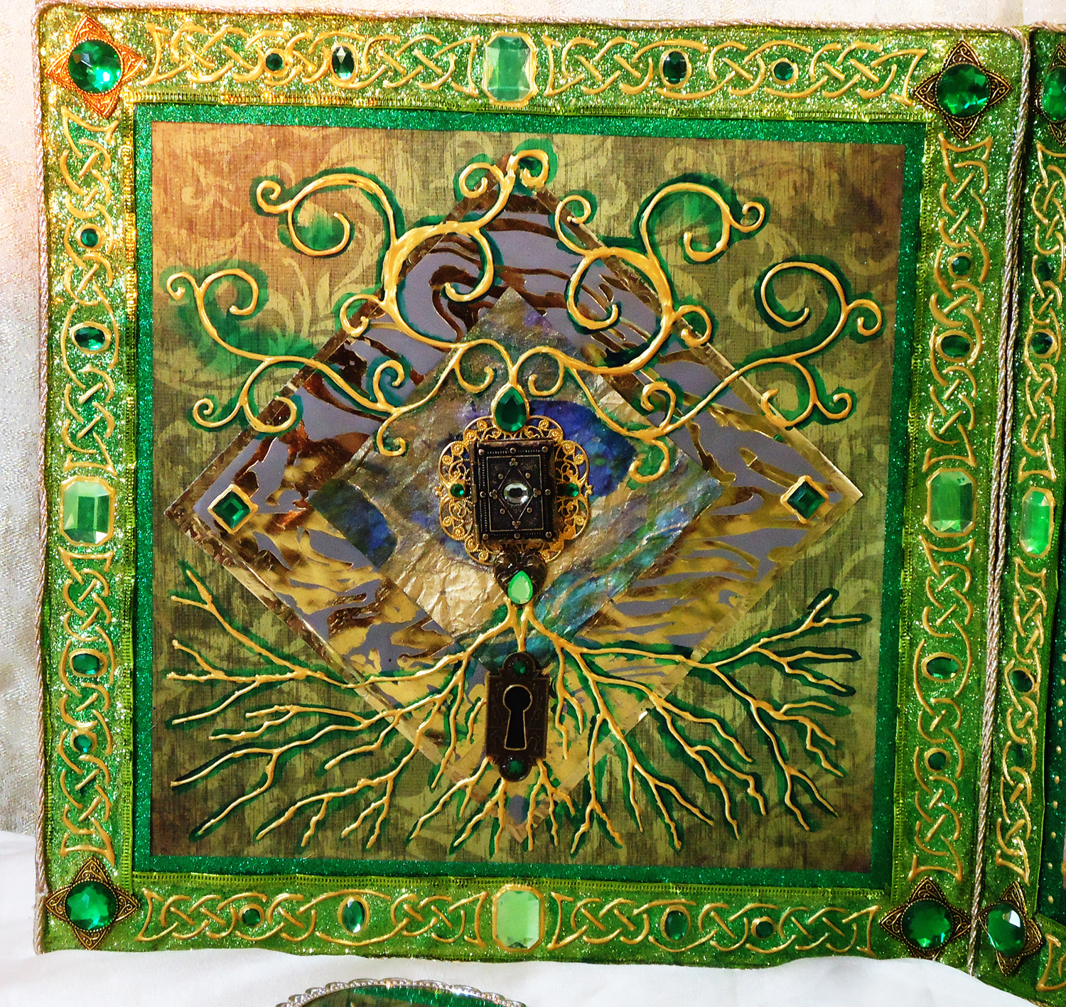 I’m pleased to offer hand-painted mixed media fairytale panels. Each individual square is 15” x 15” and these pieces can be displayed as a freestanding folding triptych on a table, or as three separate paintings hung on a wall. These lavishly decorated fairytale pieces feature metallic paint, textured fabric and paper, and embellishments such as keys, keyholes, functioning book lockets, hourglasses, and more.