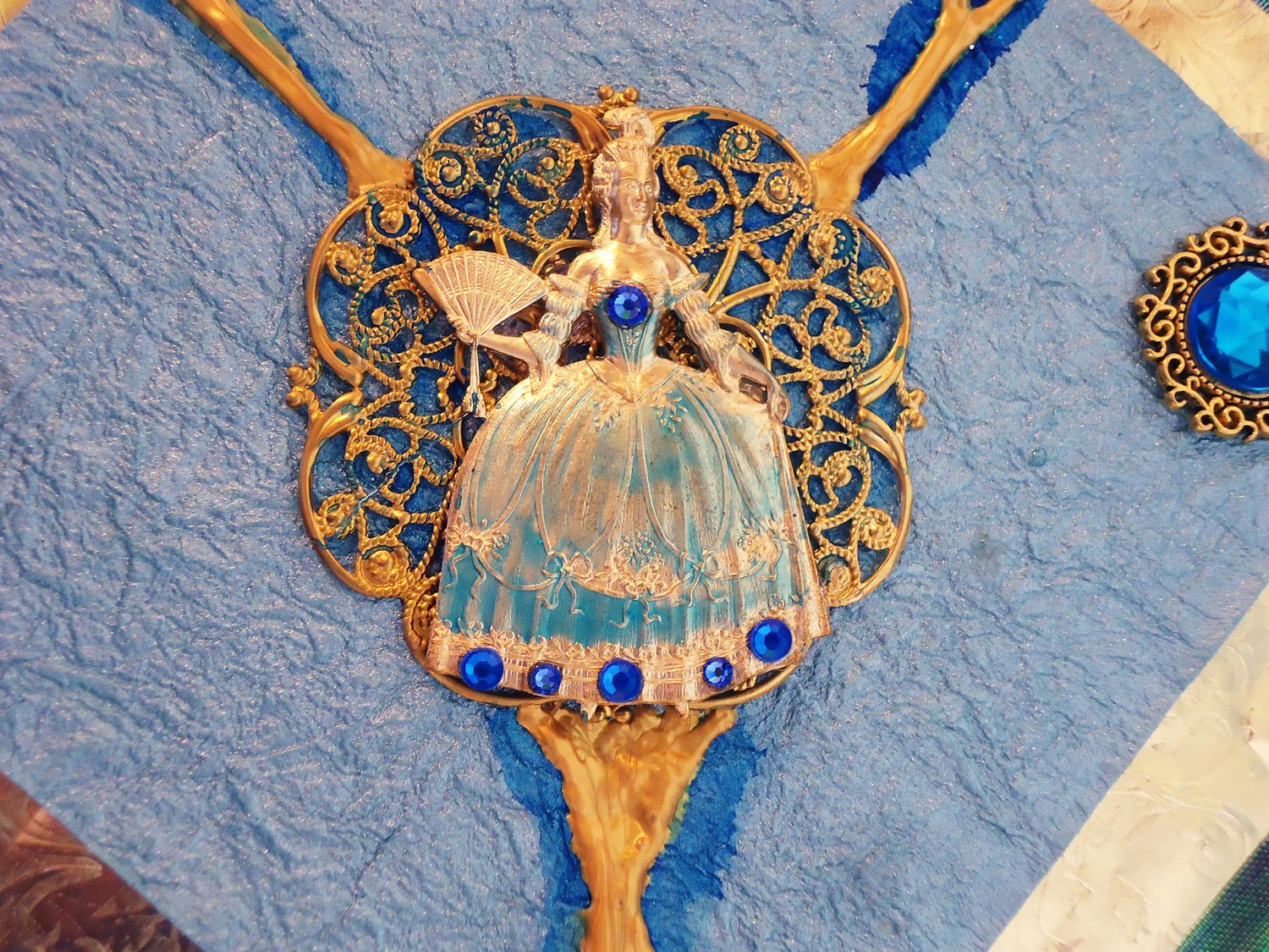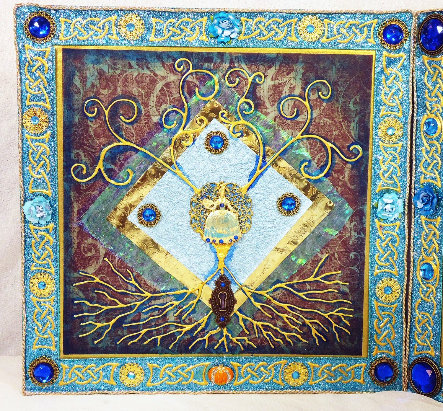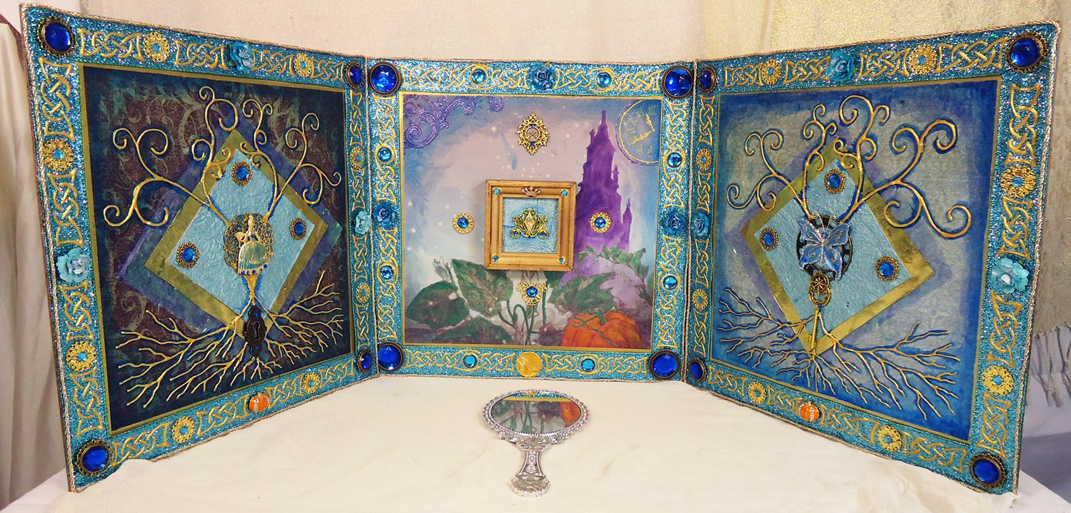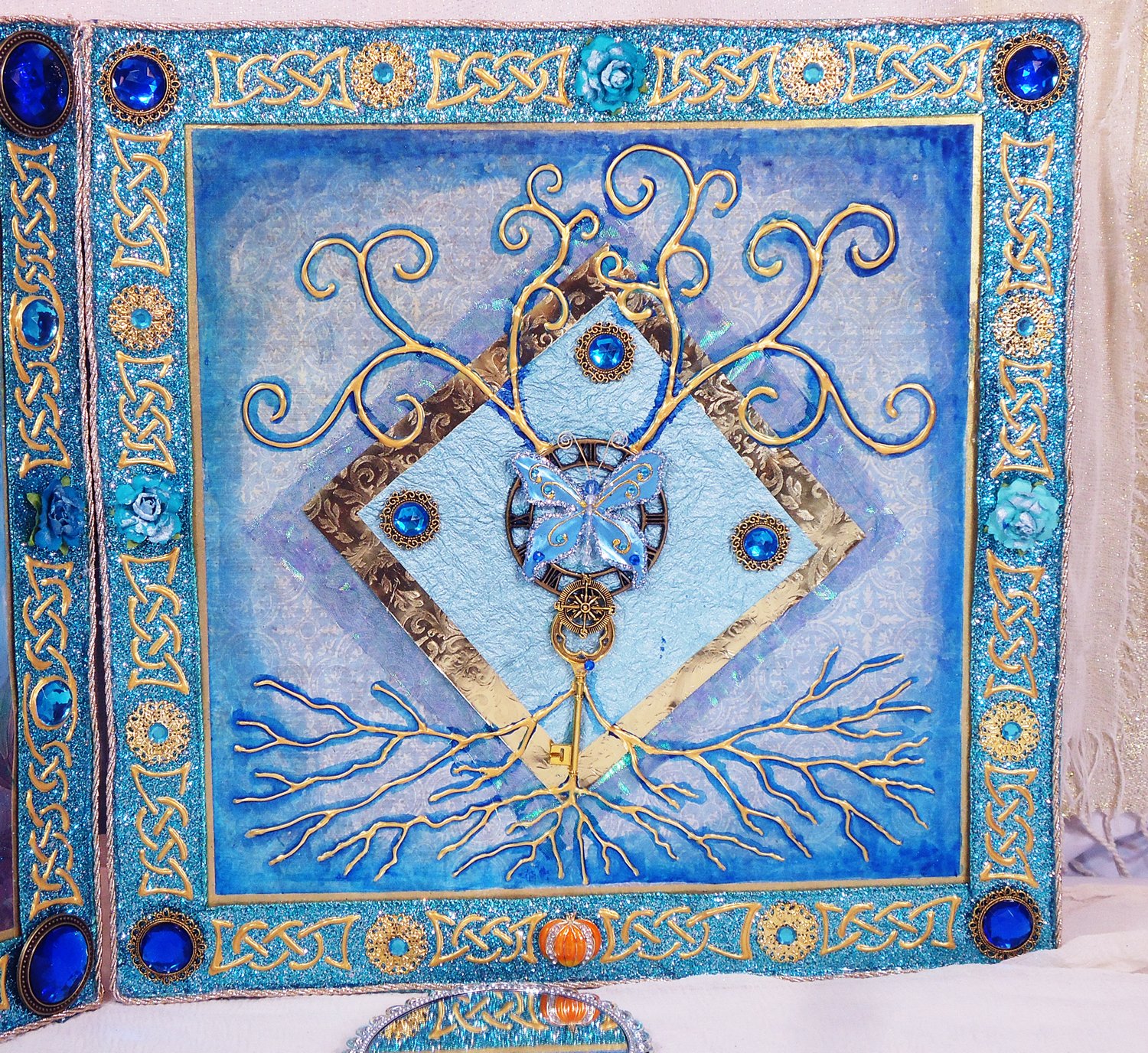 I’m pleased to offer hand-painted mixed media fairytale panels. Each individual square is 15” x 15” and these pieces can be displayed as a freestanding folding triptych on a table, or as three separate paintings hung on a wall. These lavishly decorated fairytale pieces feature metallic paint, textured fabric and paper, and embellishments such as keys, keyholes, functioning book lockets, hourglasses, and more.