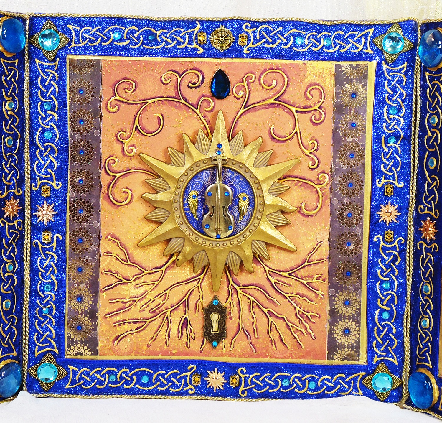 This elegant piece is inspired by the Conjure One song, "Center of the Sun," and features a gilded sun frame, a metal violin charm, key and lock, as well as other embellishments.