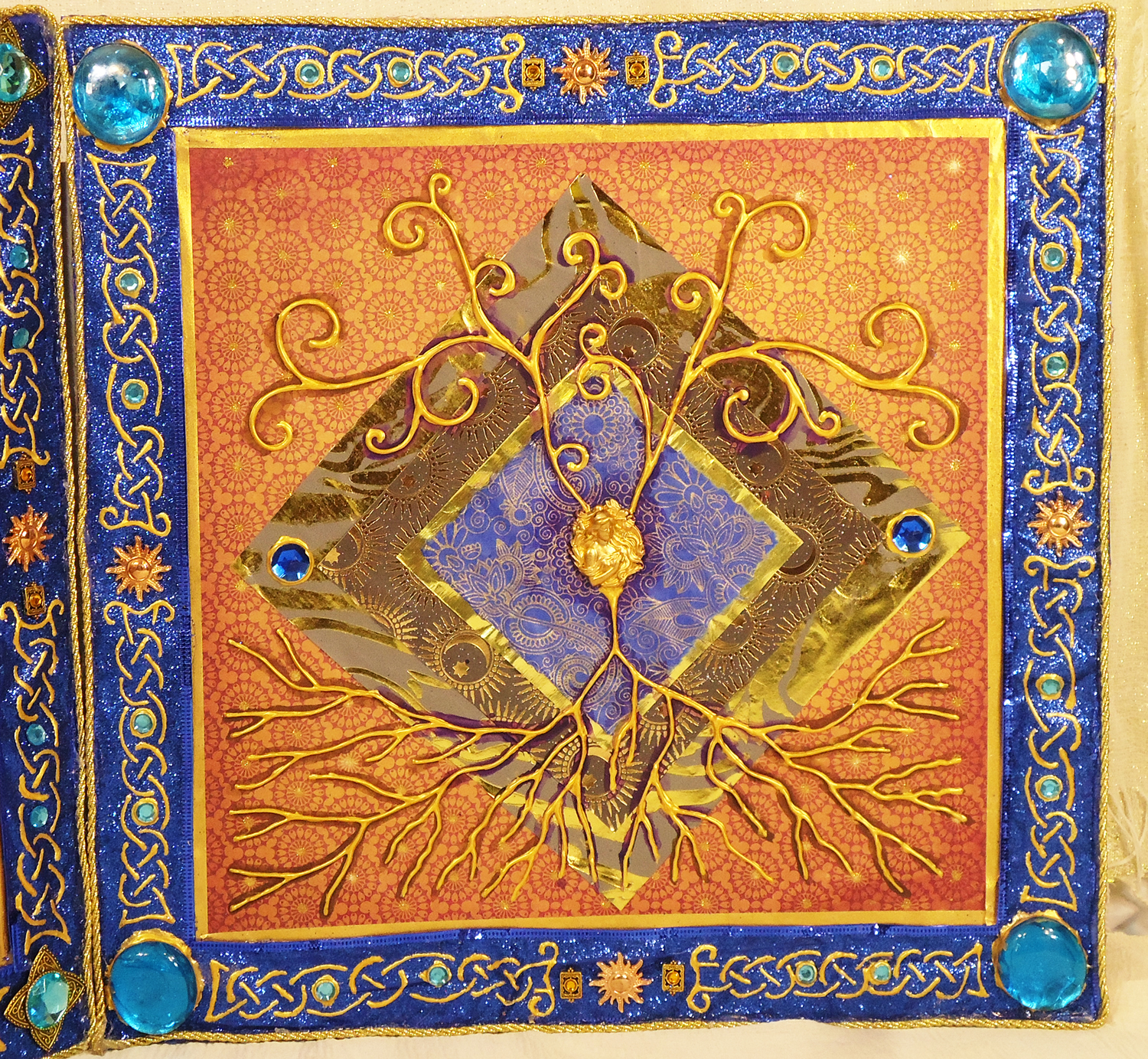 I’m pleased to offer hand-painted mixed media fairytale panels. Each individual square is 15” x 15” and these pieces can be displayed as a freestanding folding triptych on a table, or as three separate paintings hung on a wall. These lavishly decorated fairytale pieces feature metallic paint, textured fabric and paper, and embellishments such as keys, keyholes, functioning book lockets, hourglasses, and more.