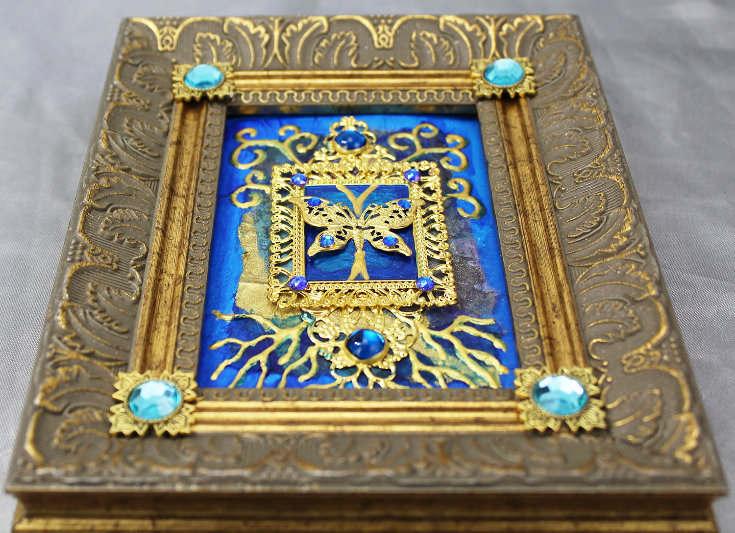 Gold and silver paint, tissue paper, acrylics, watercolors, textured paper, jewels, charms, metal objects.