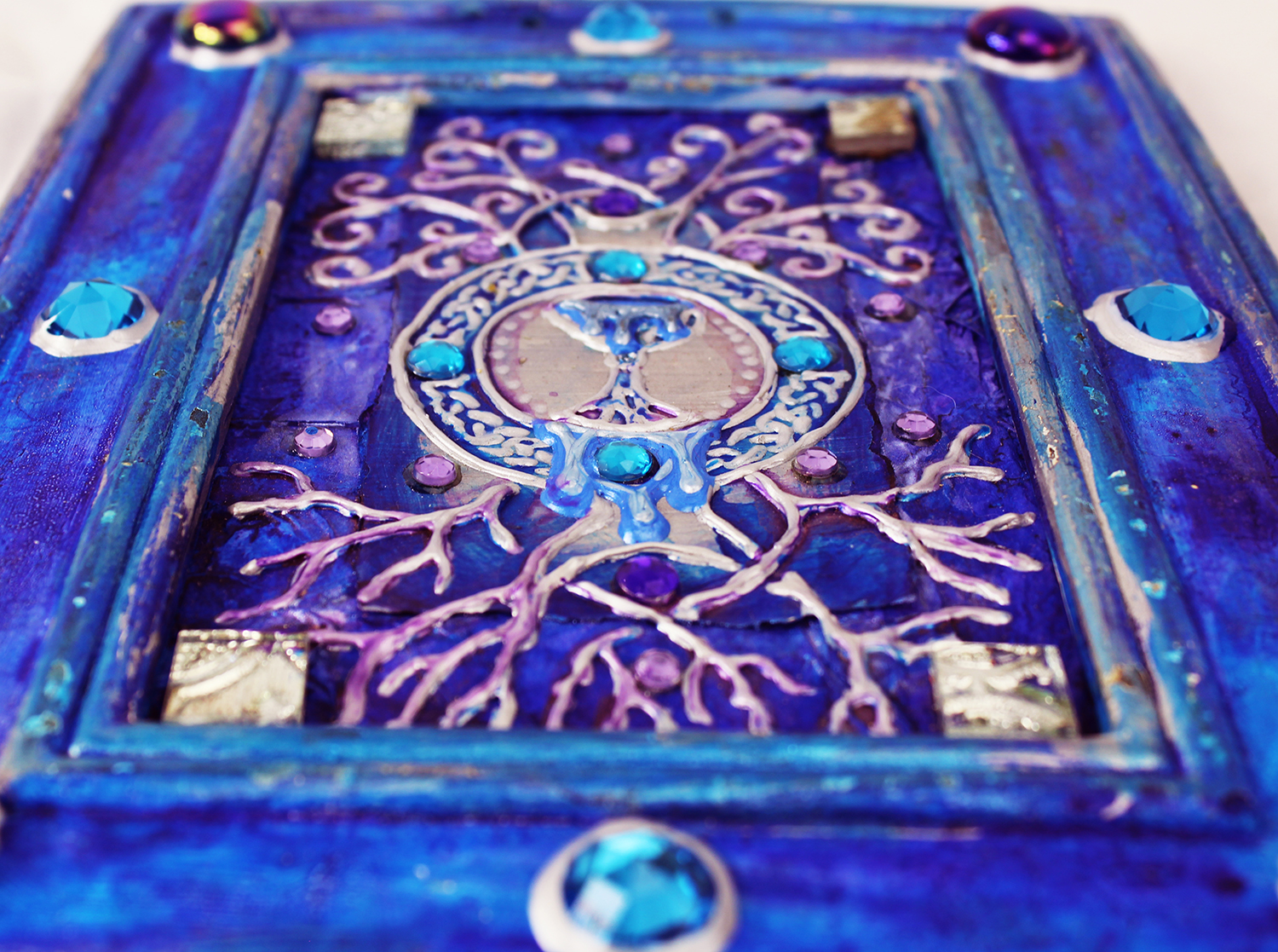Gold and silver paint, tissue paper, acrylics, watercolors, textured paper, jewels, charms, metal objects.