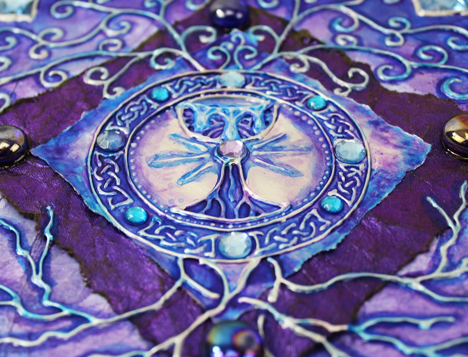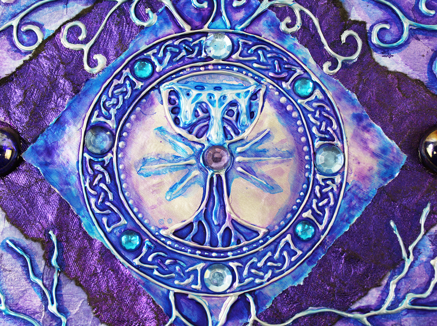 Gold and silver paint, tissue paper, acrylics, watercolors, textured paper, jewels, charms, metal objects.
