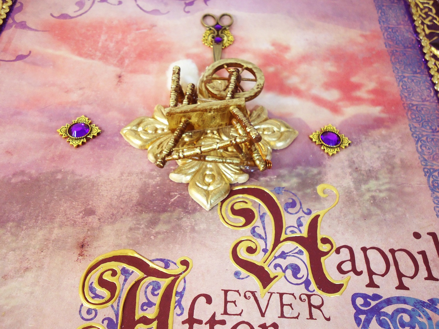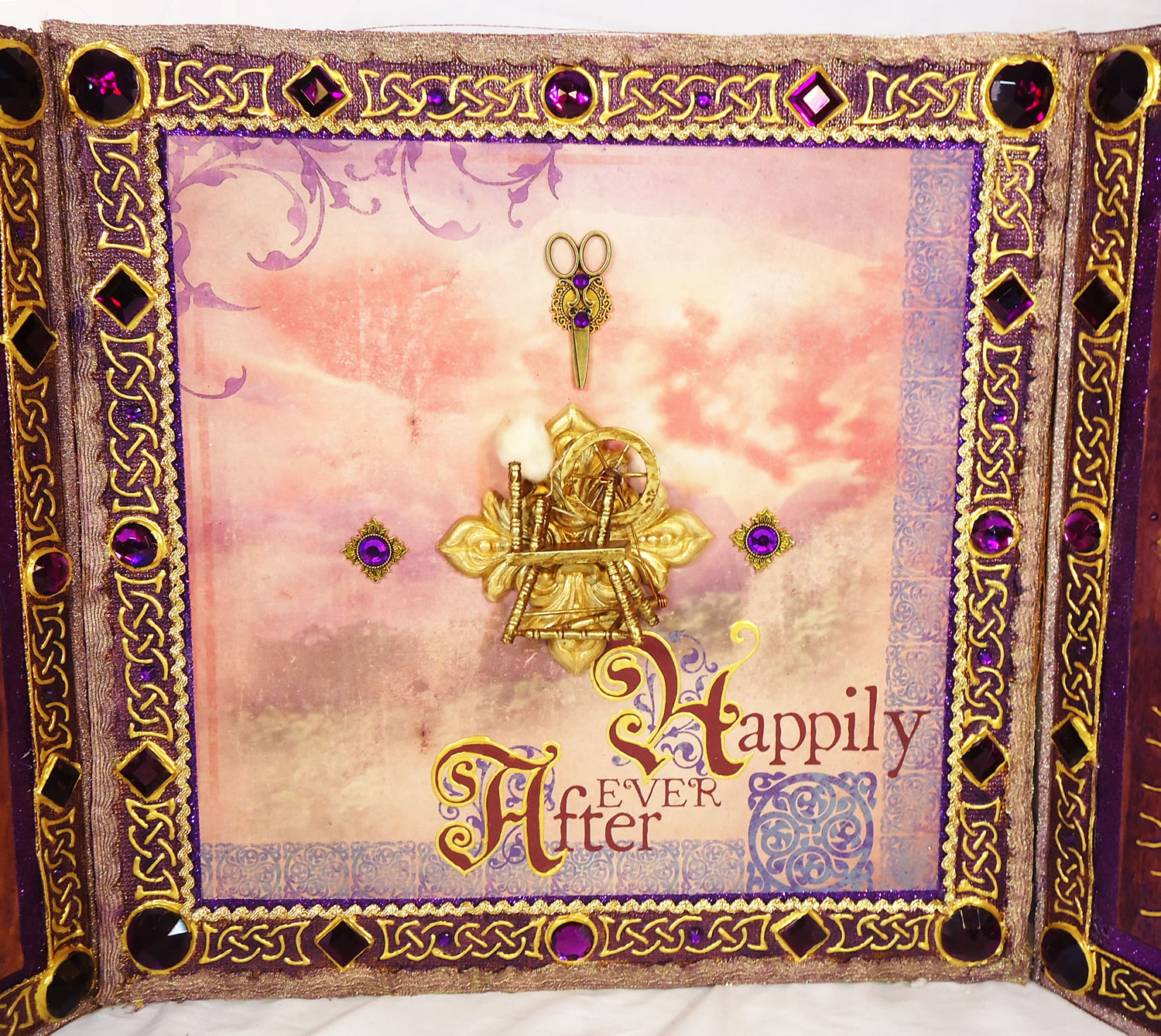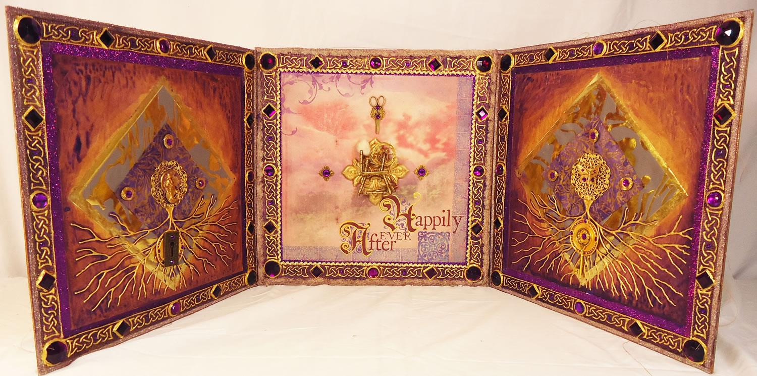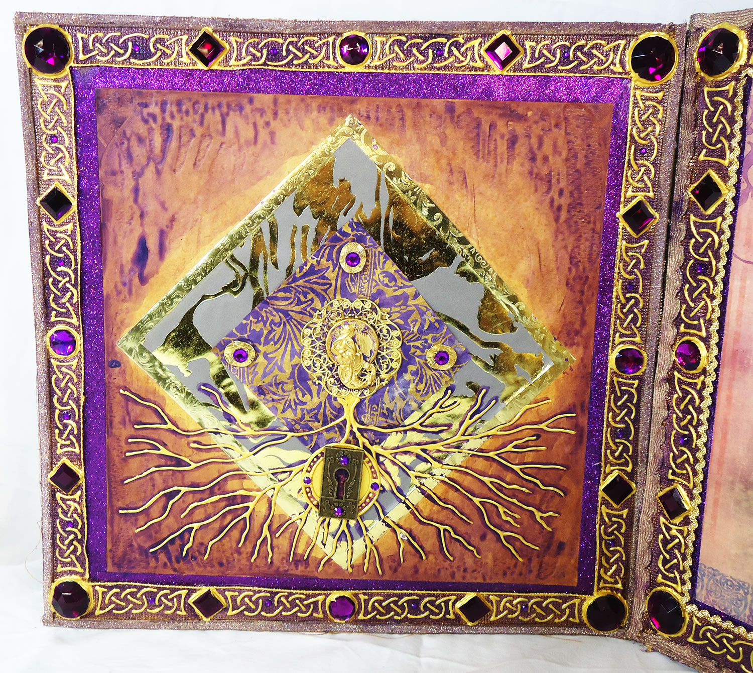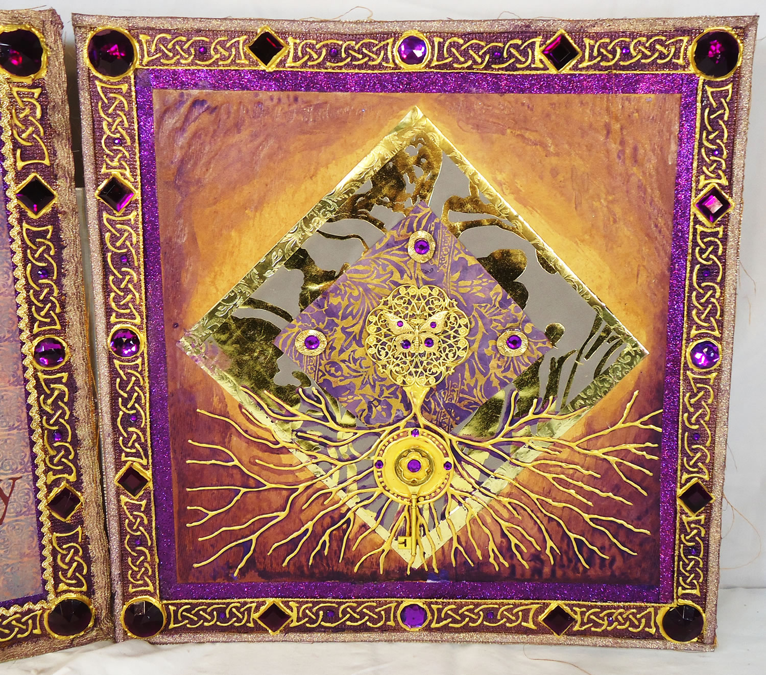 I’m pleased to offer hand-painted mixed media fairytale panels. Each individual square is 15” x 15” and these pieces can be displayed as a freestanding folding triptych on a table, or as three separate paintings hung on a wall. These lavishly decorated fairytale pieces feature metallic paint, textured fabric and paper, and embellishments such as keys, keyholes, functioning book lockets, hourglasses, and more.