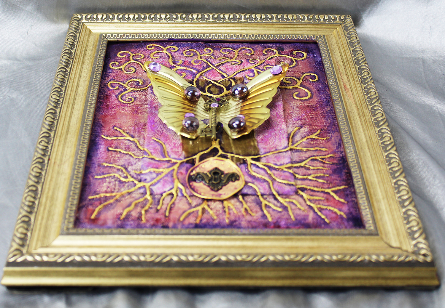 These pieces are created from layered and textured paint, paper, fabric, and other with raised gold or silver paint to create the design. The frame is included.