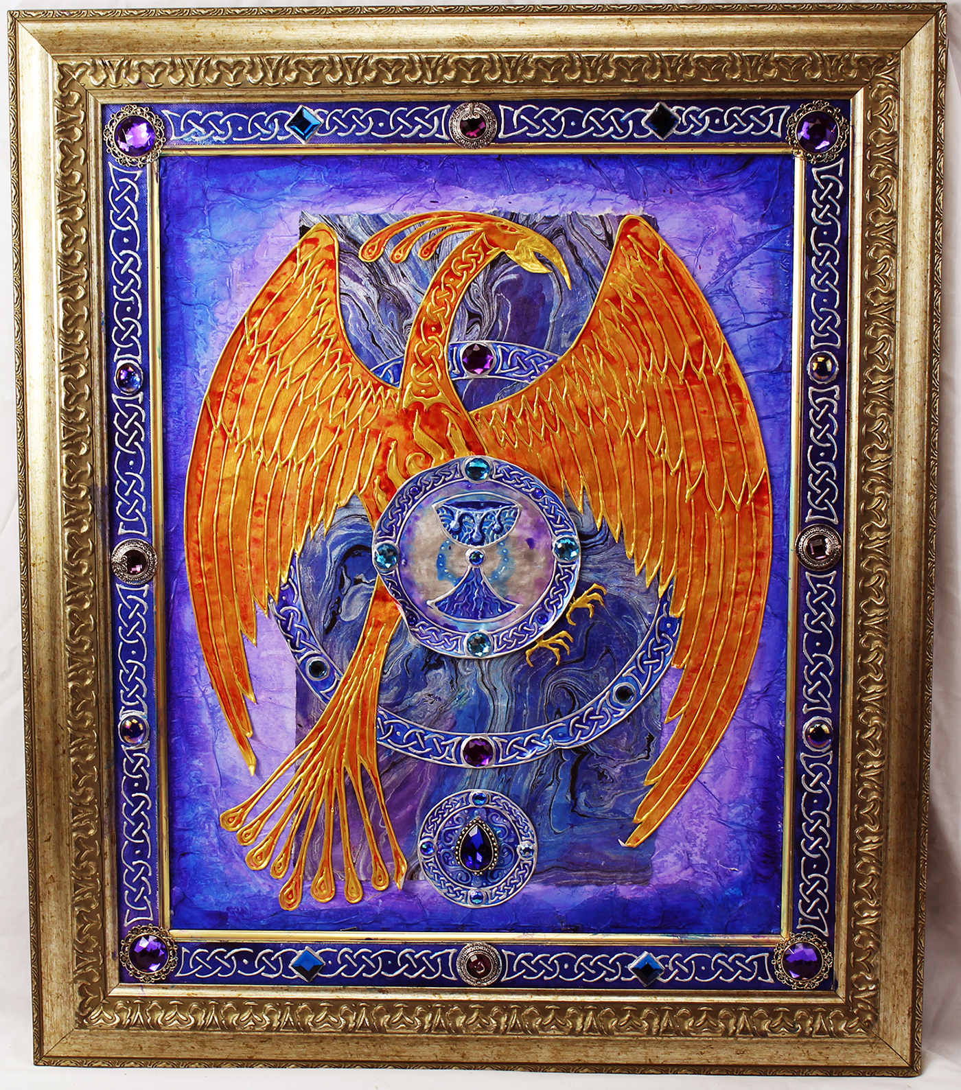 These pieces are created from layered and textured paint, paper, fabric, and other with raised gold or silver paint to create the design. The frame is included.